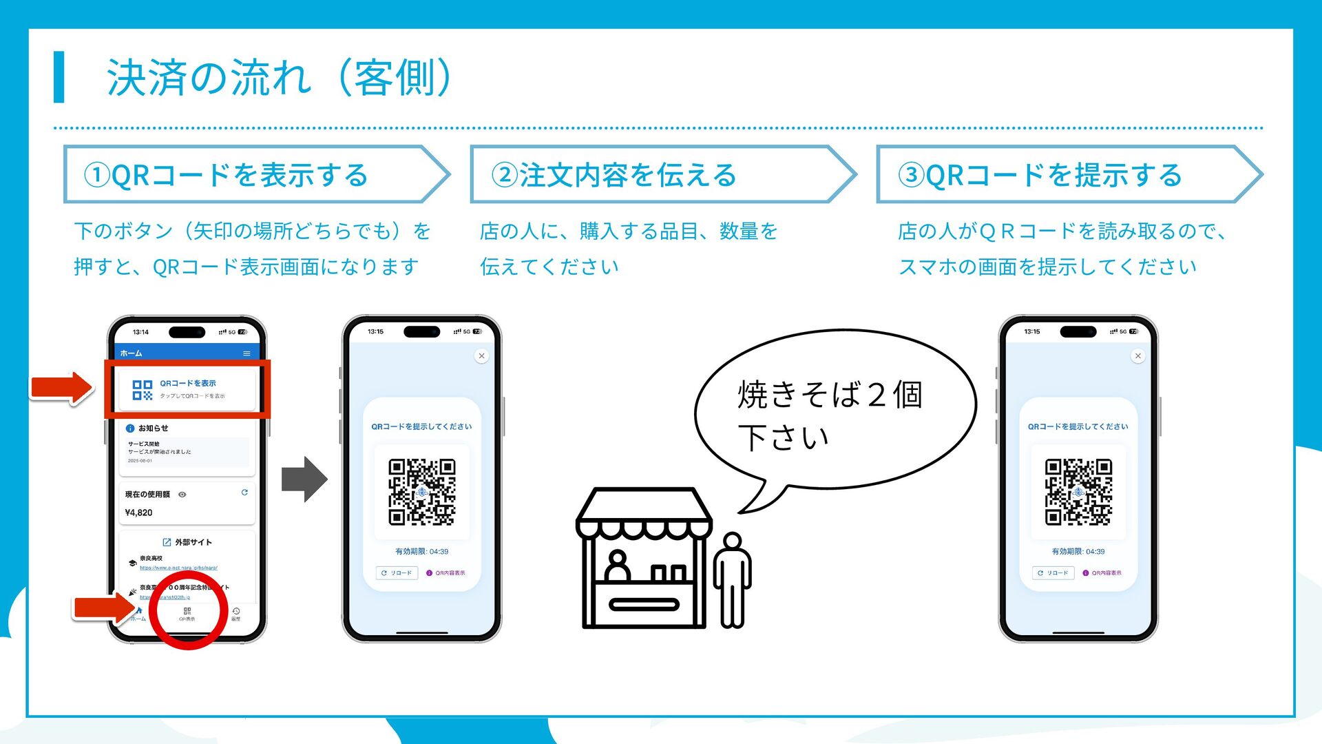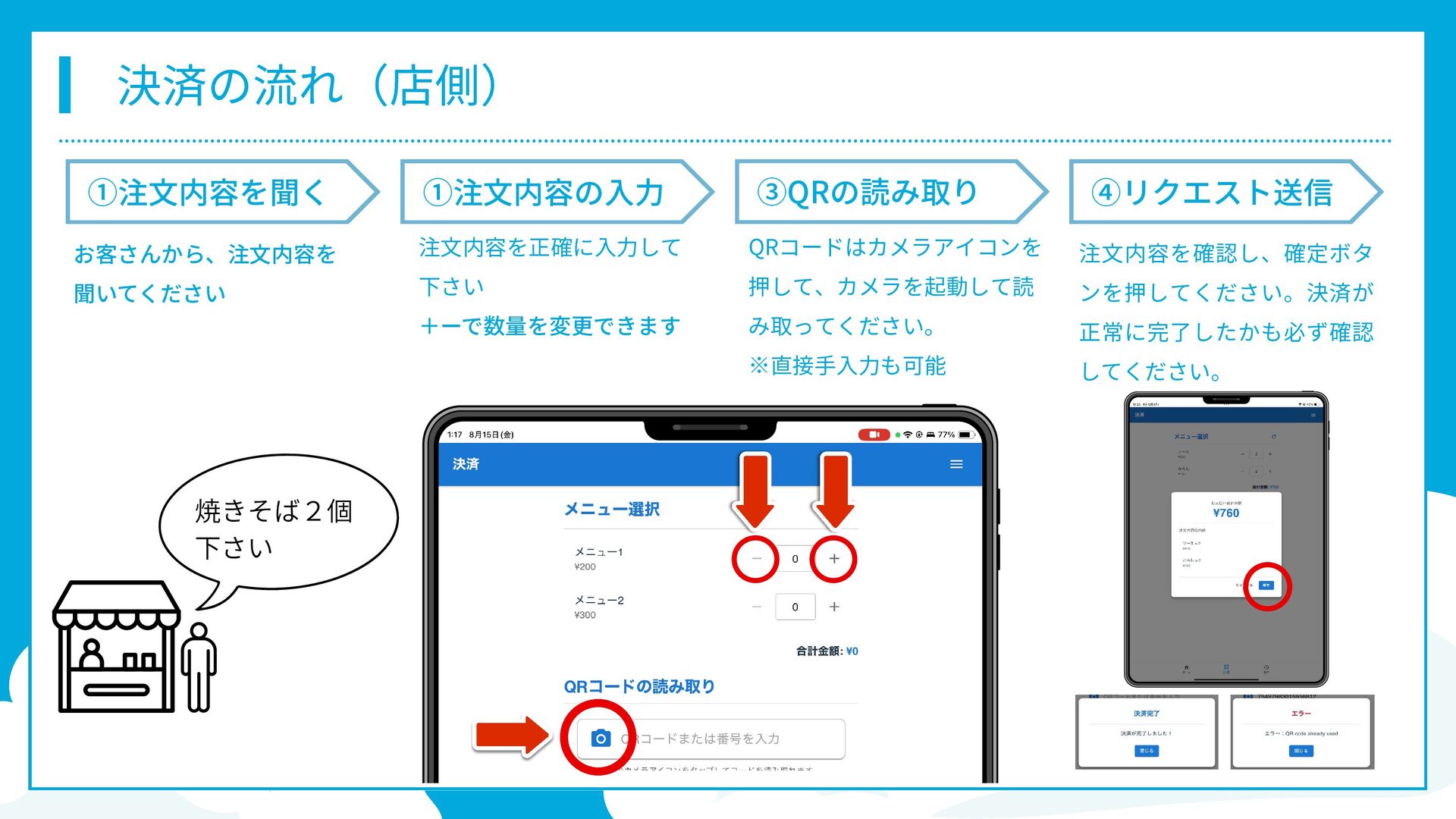 ンを押してください。決済が 正常に完了したかも必ず確認 してください。 焼きそば2個 下さい ④リクエスト送信 ③QRの読み取り 注文内容を正確に入力して 下さい +ーで数量を変更できます
