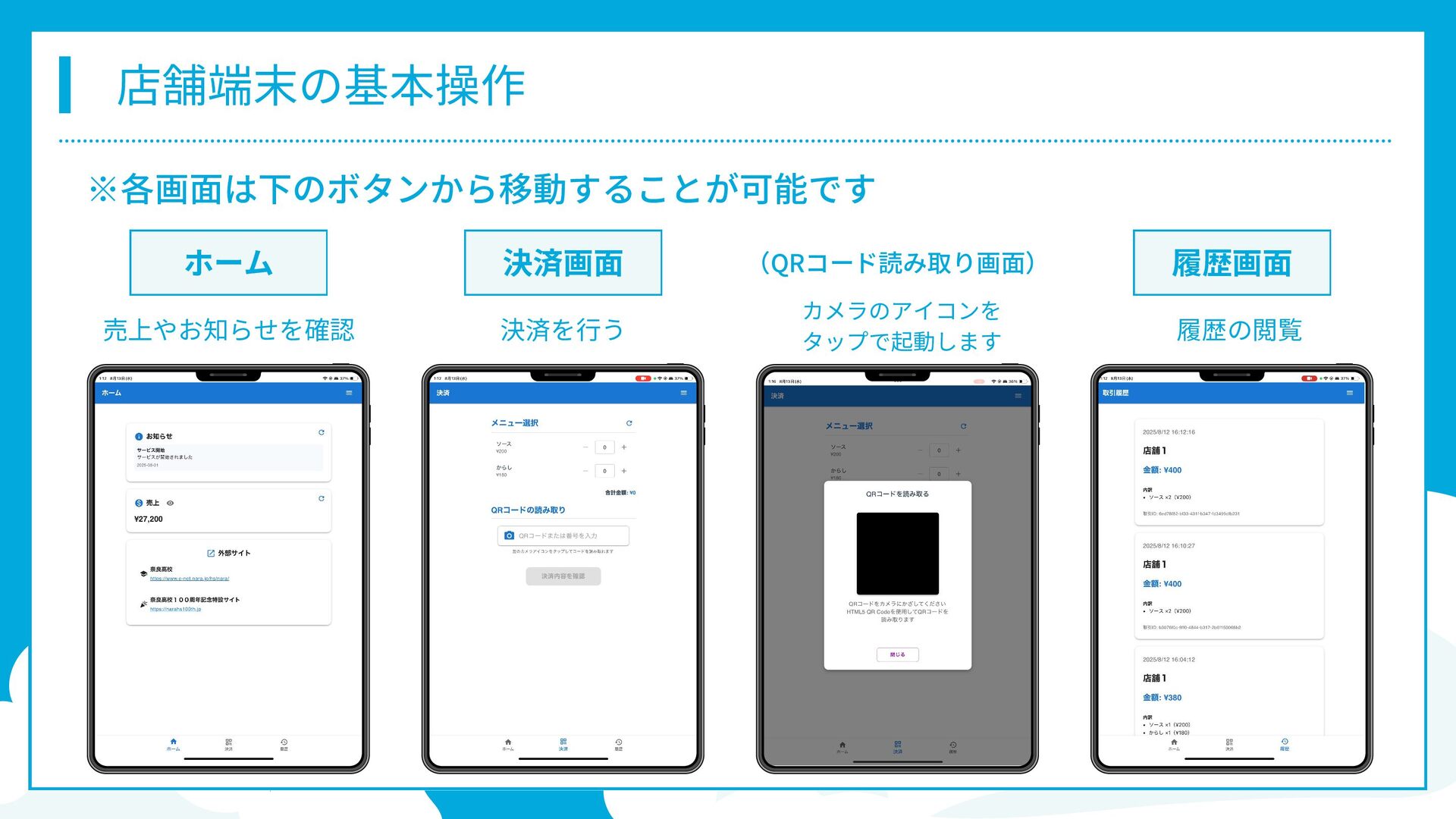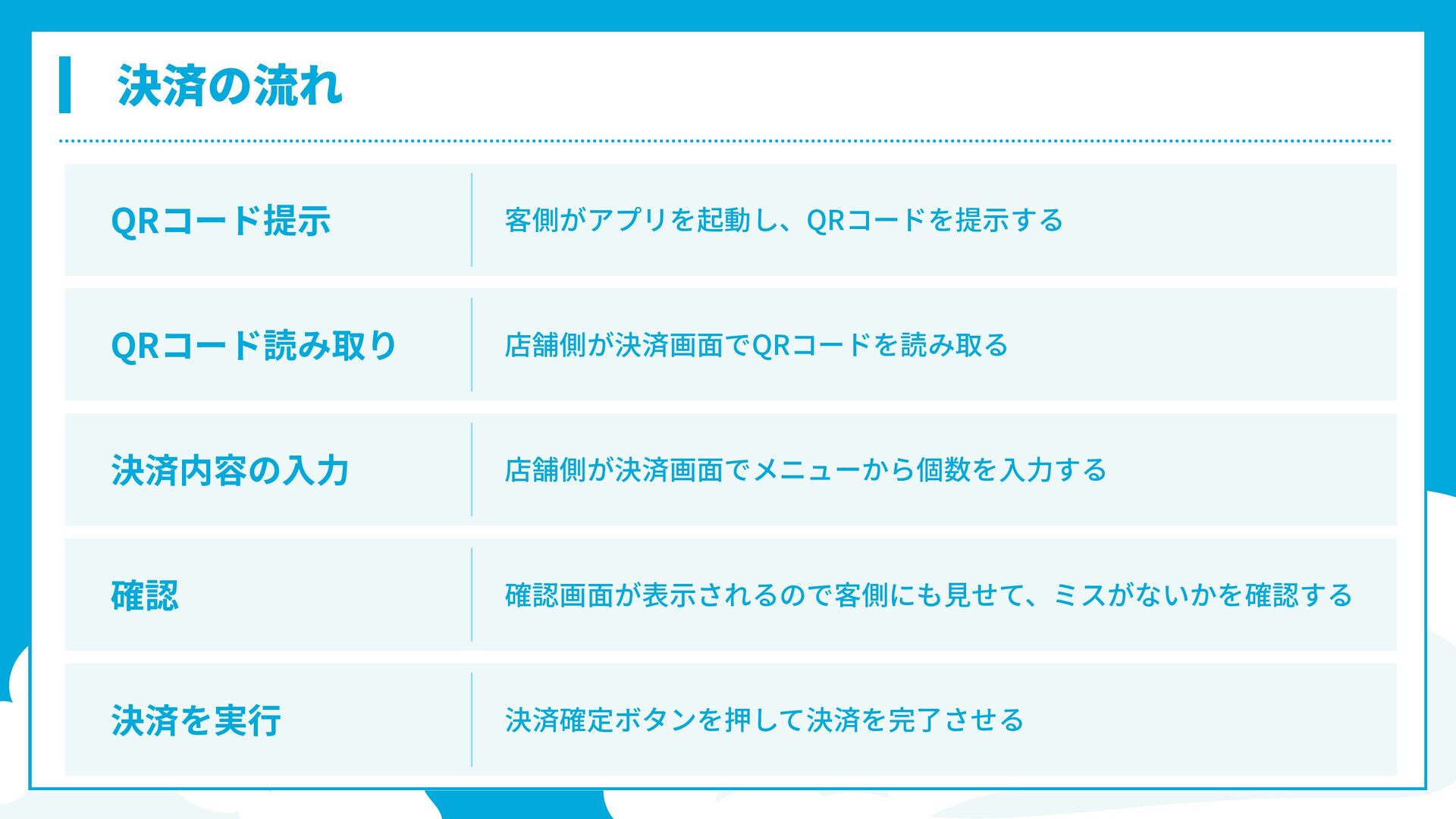 4. ①注文内容を聞く ①注文内容の入力 決済の流れ(店側) お客さんから、注文内容を 聞いてください QRコードはカメラアイコンを 押して、カメラを起動して読 み取ってください。 ※直接手入力も可能 注文内容を確認し、確定ボタ