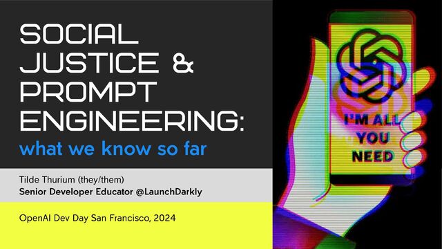 Large language models are only as good as the data we feed into them. Unfortunately, we haven't quite dismantled racism, sexism, and all the other -isms just yet. Given the imperfect tools that we have, how can we write LLM prompts that are less likely to reflect our own biases? In this session, Tilde will review current research about LLM prompt engineering and bias, including practical examples. You'll leave with some ideas that you can apply as both users and builders of LLM applications, to iterate towards a more equitable world.