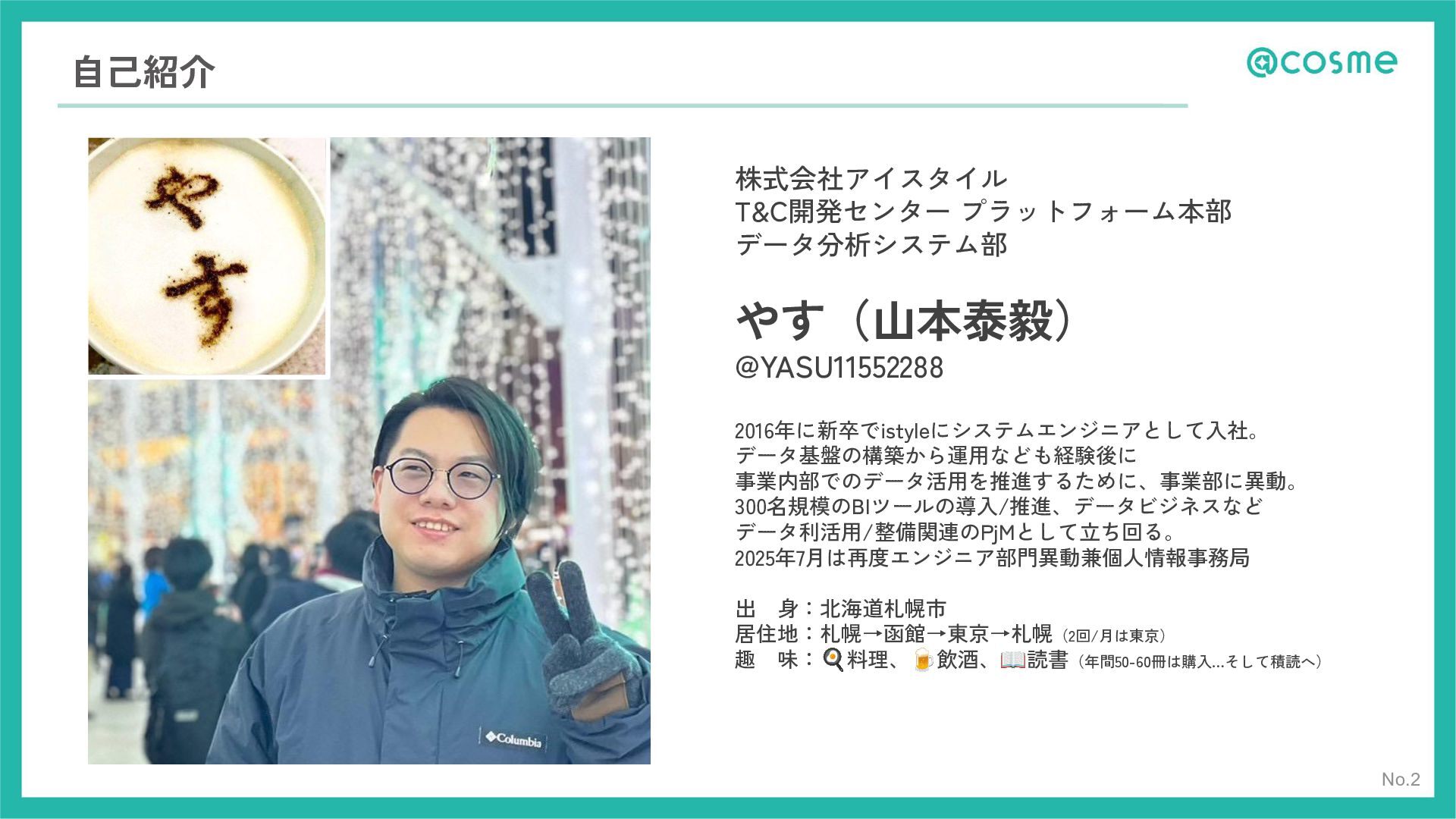 自己紹介 No.2 株式会社アイスタイル T&C開発センター プラットフォーム本部 データ分析システム部 やす(山本泰毅) @YASU11552288 2016年に新卒でistyleにシステムエンジニアとして入社。 データ基盤の構築から運用なども経験後に