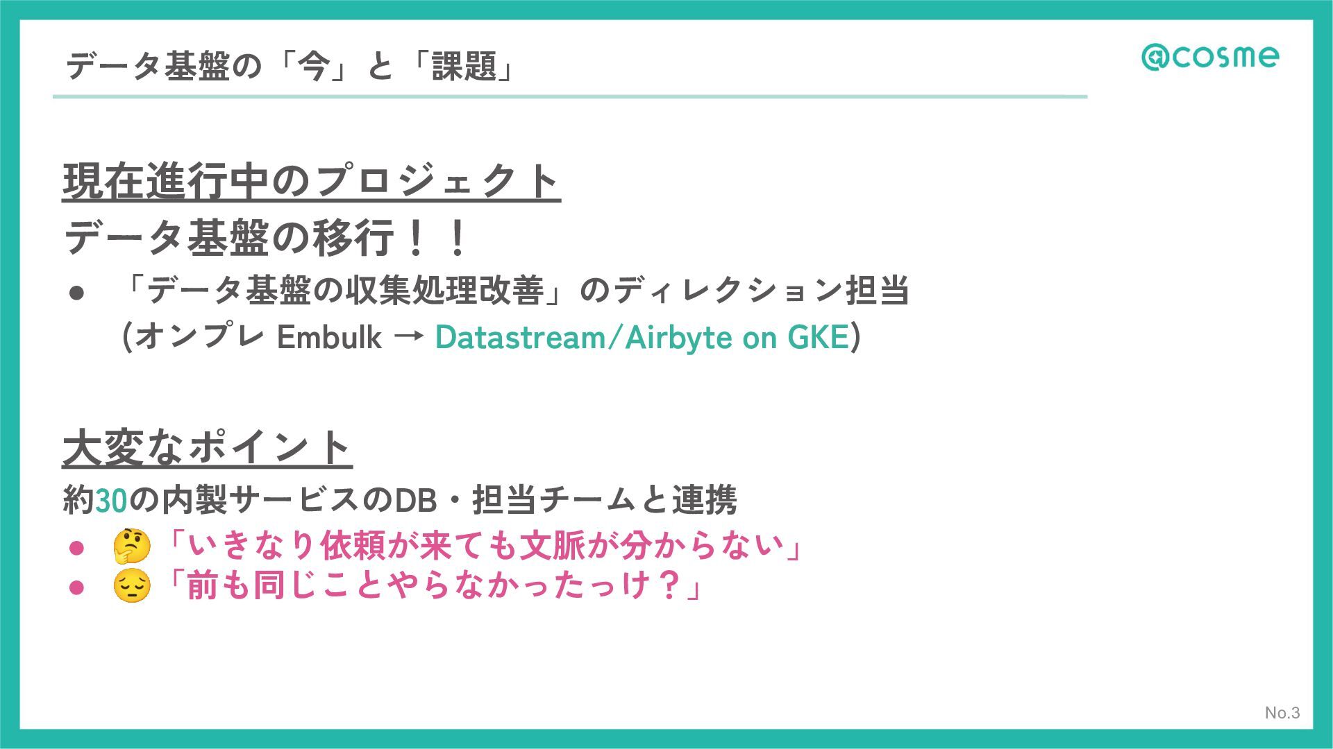 データ基盤の「今」と「課題」 No.3 現在進行中のプロジェクト データ基盤の移行!! • 「データ基盤の収集処理改善」のディレクション担当 (オンプレ Embulk → Datastream/Airbyte