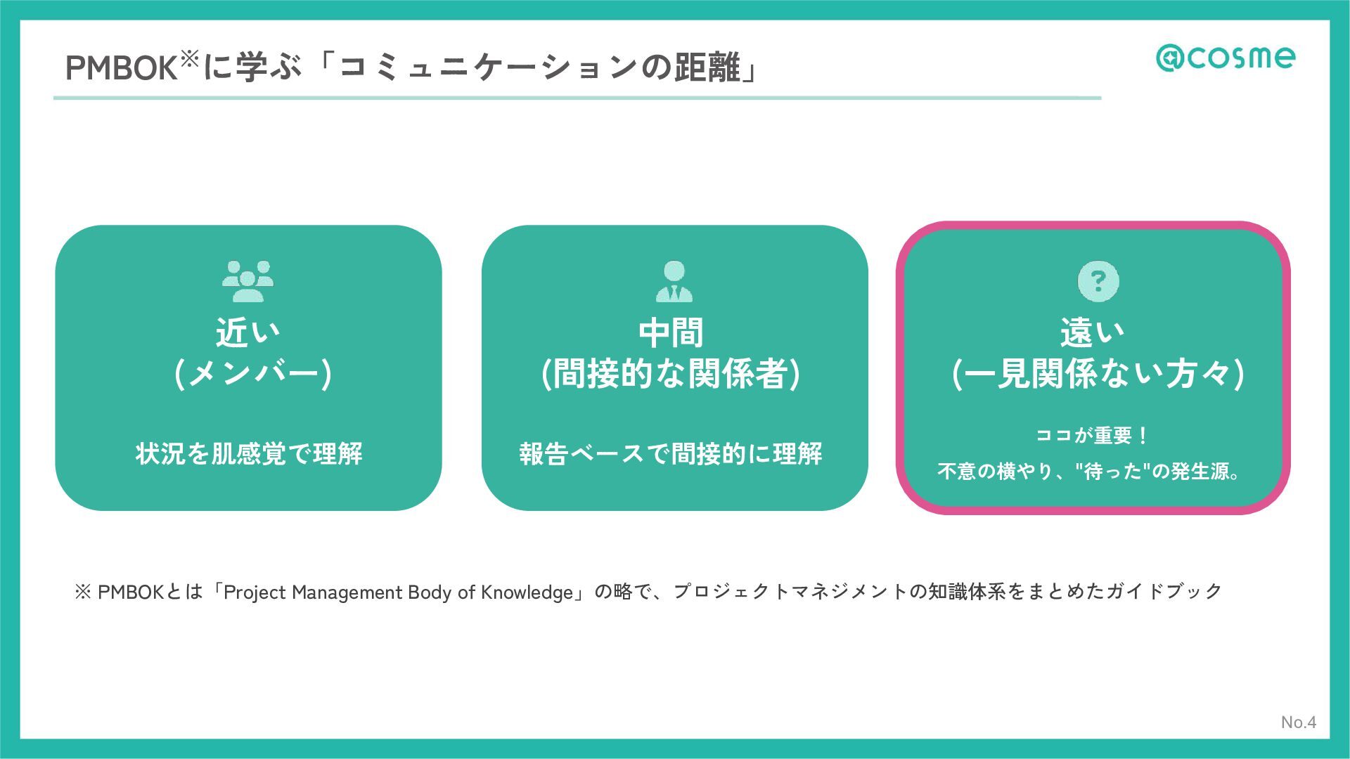 PMBOK※に学ぶ「コミュニケーションの距離」 No.4 中間 (間接的な関係者) 報告ベースで間接的に理解 近い (メンバー) 状況を肌感覚で理解 遠い (一見関係ない方々)