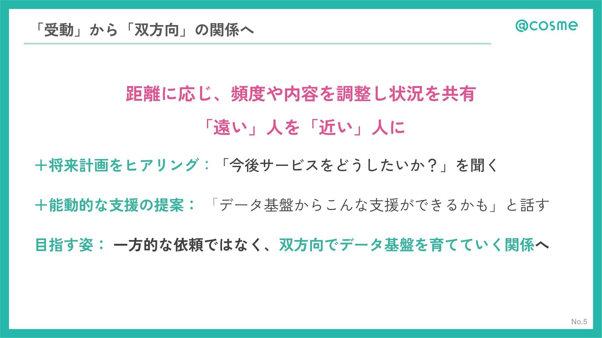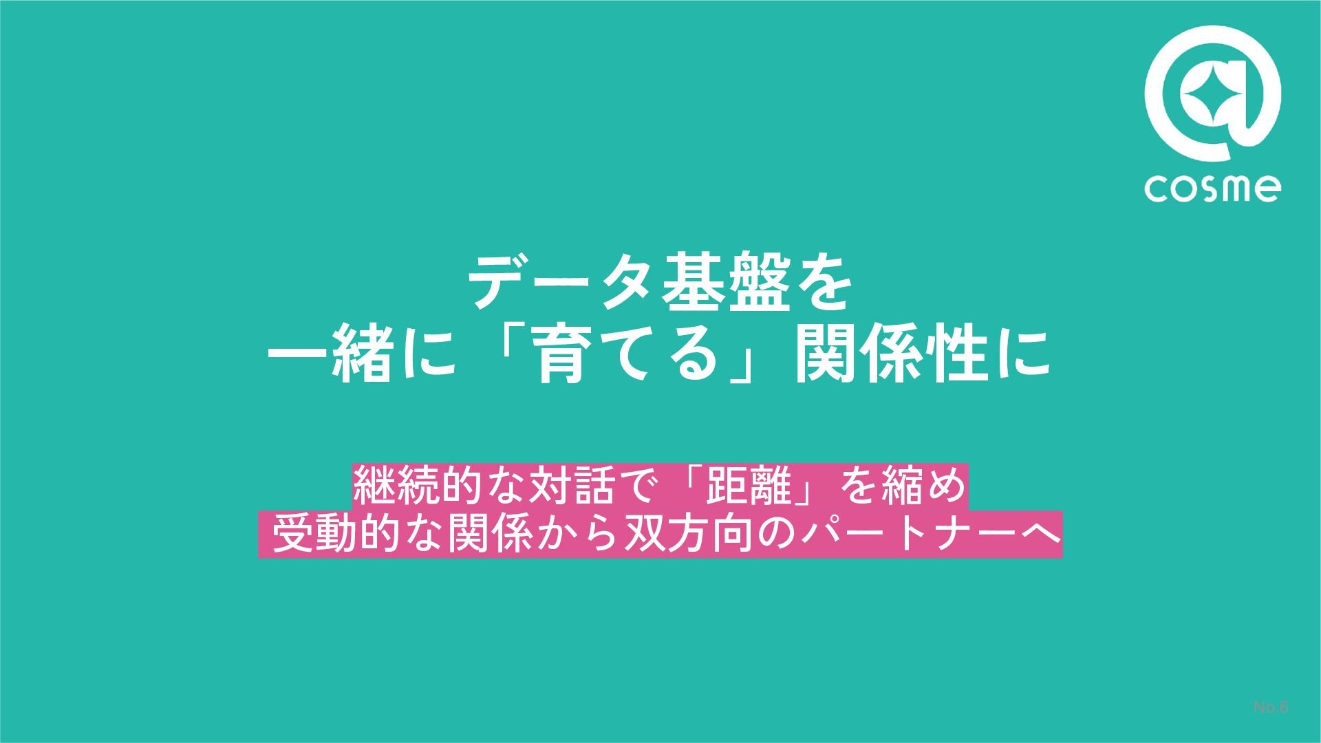 No.6 データ基盤を 一緒に「育てる」関係性に 継続的な対話で「距離」を縮め 受動的な関係から双方向のパートナーへ