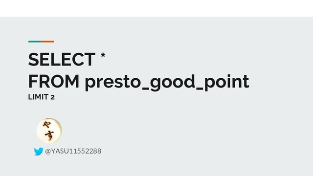SELECT * FROM presto_good_point LIMIT 2 @YASU11552288