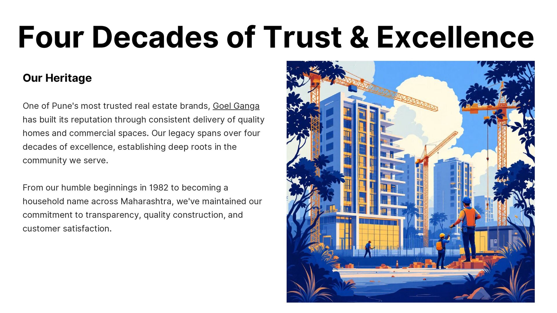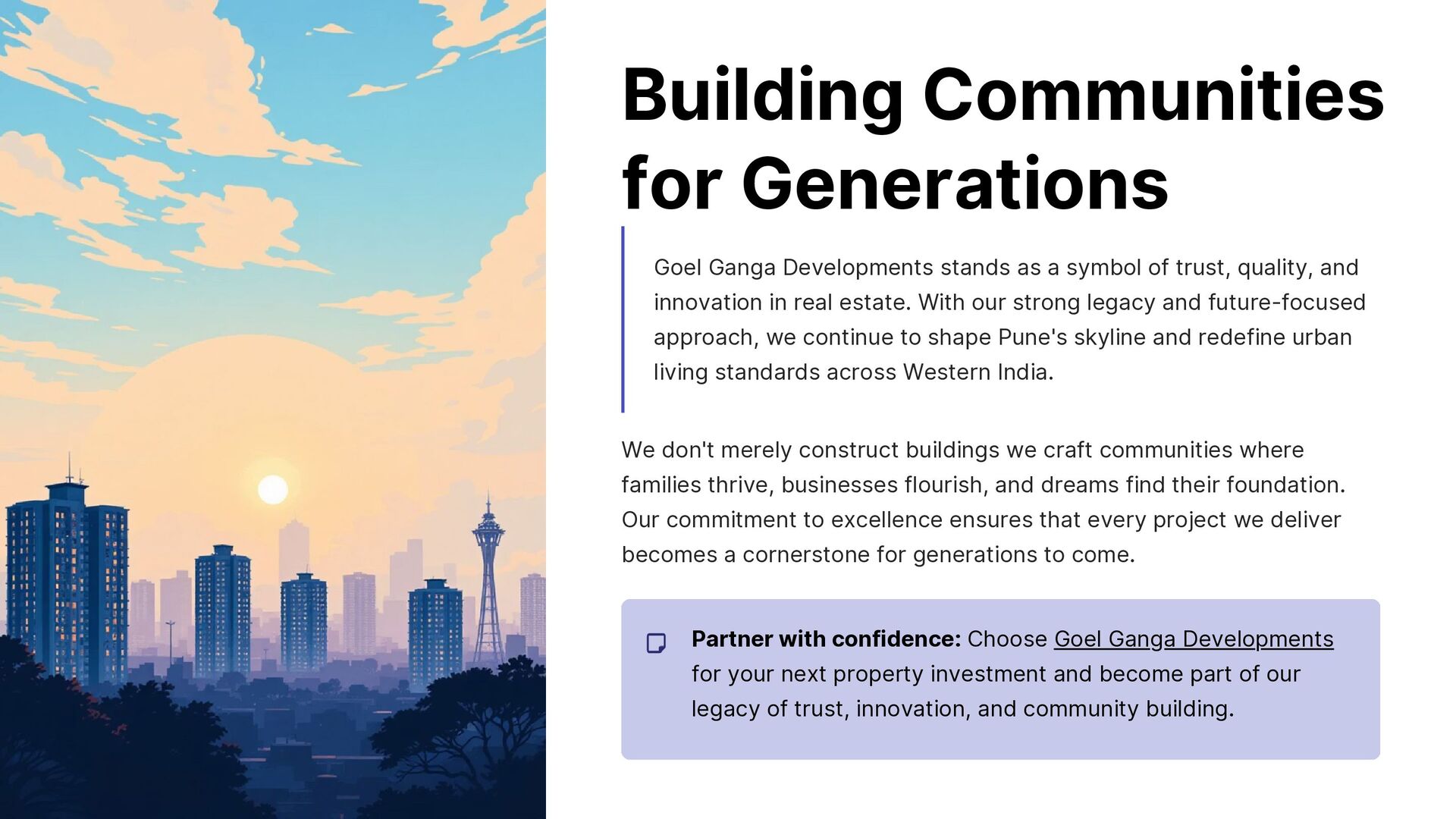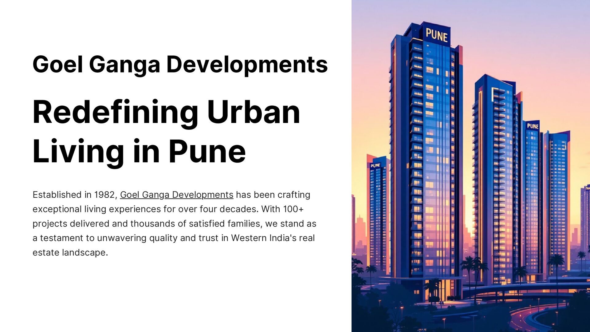 Goel Ganga Developments has been transforming Pune’s skyline for over four decades with 100+ landmark projects. Known for trust, timely delivery, and sustainable design, the company builds not just homes but complete communities. With a focus on quality, innovation, and customer satisfaction, Goel Ganga continues to lead urban development in Western India.