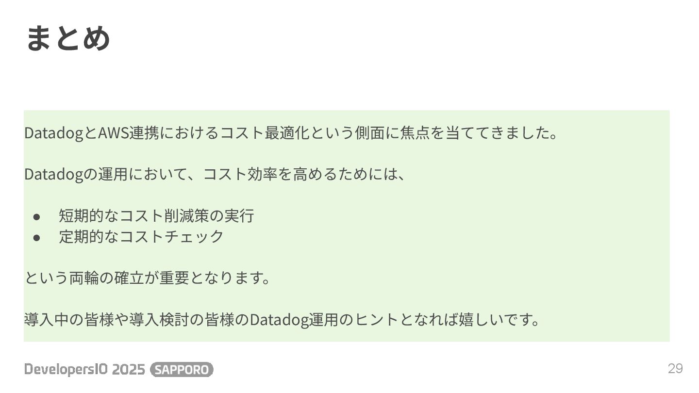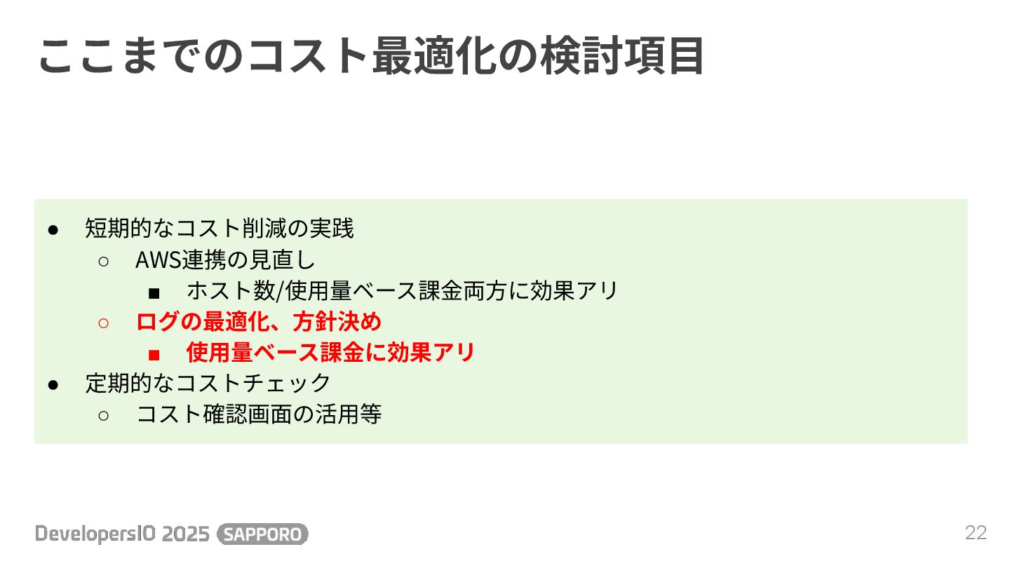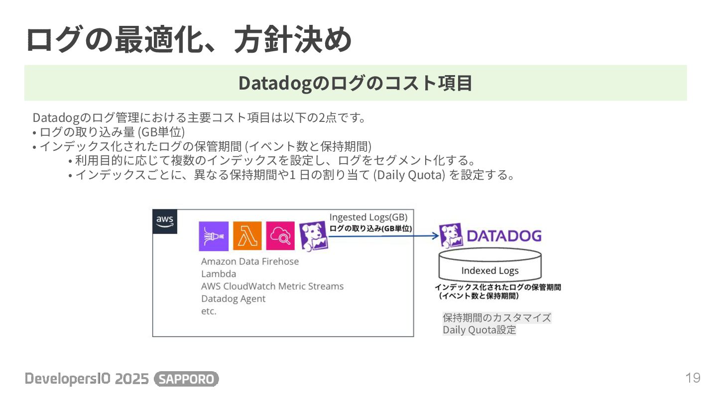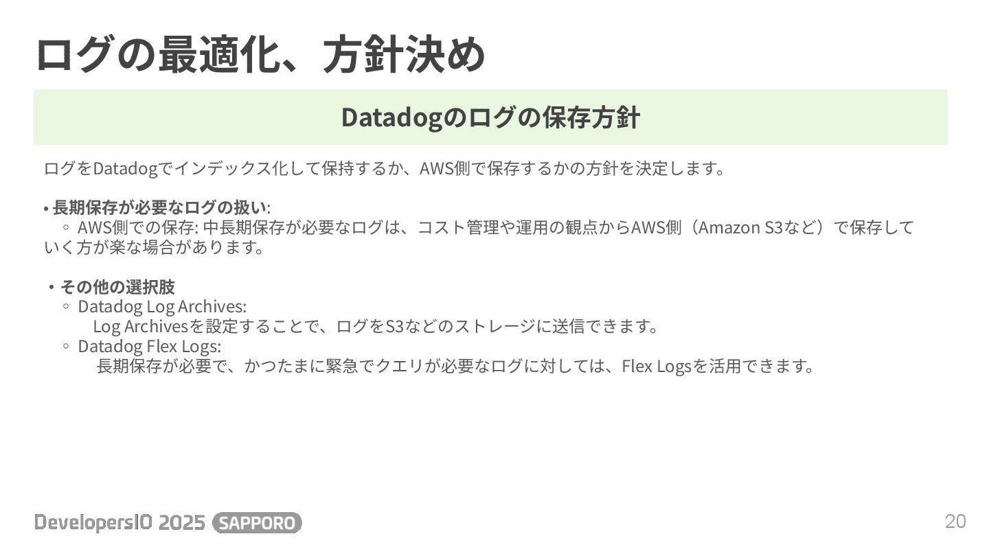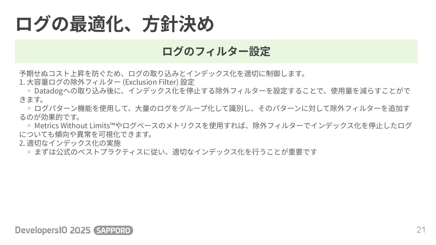Datadogへの取り込み後に、インデックス化を停⽌する除外フィルターを設定することで、使⽤量を減らすことがで きます。 ◦ ログパターン機能を使⽤して、⼤量のログをグループ化して識別し、そのパターンに対して除外フィルターを追加す るのが効果的です。 ◦ Metrics Without Limits™やログベースのメトリクスを使⽤すれば、除外フィルターでインデックス化を停⽌したログ についても傾向や異常を可視化できます。 2. 適切なインデックス化の実施 ◦ まずは公式のベストプラクティスに従い、適切なインデックス化を⾏うことが重要です