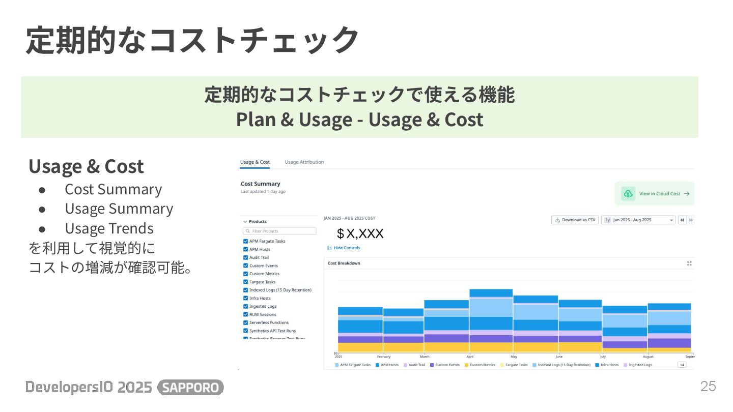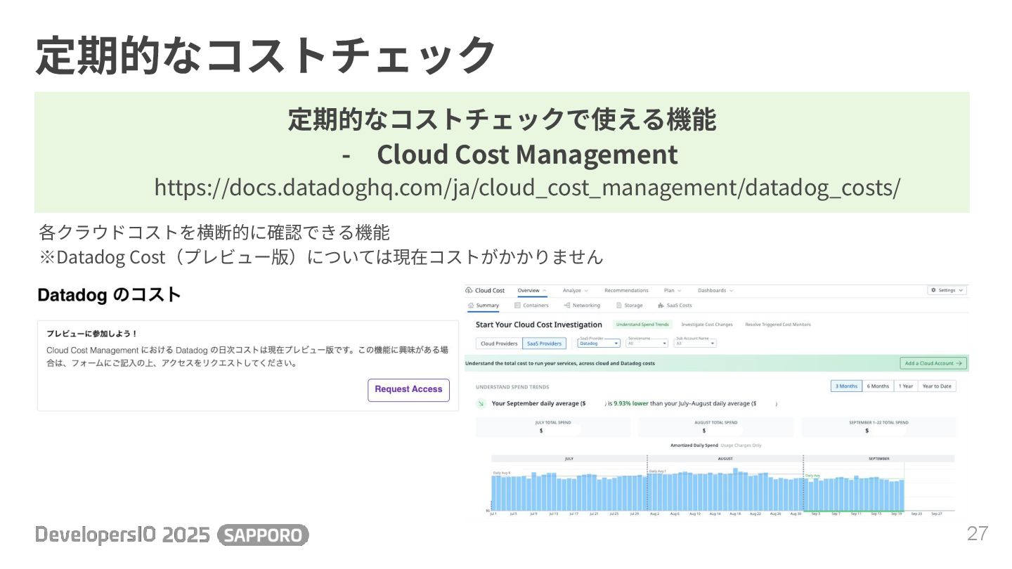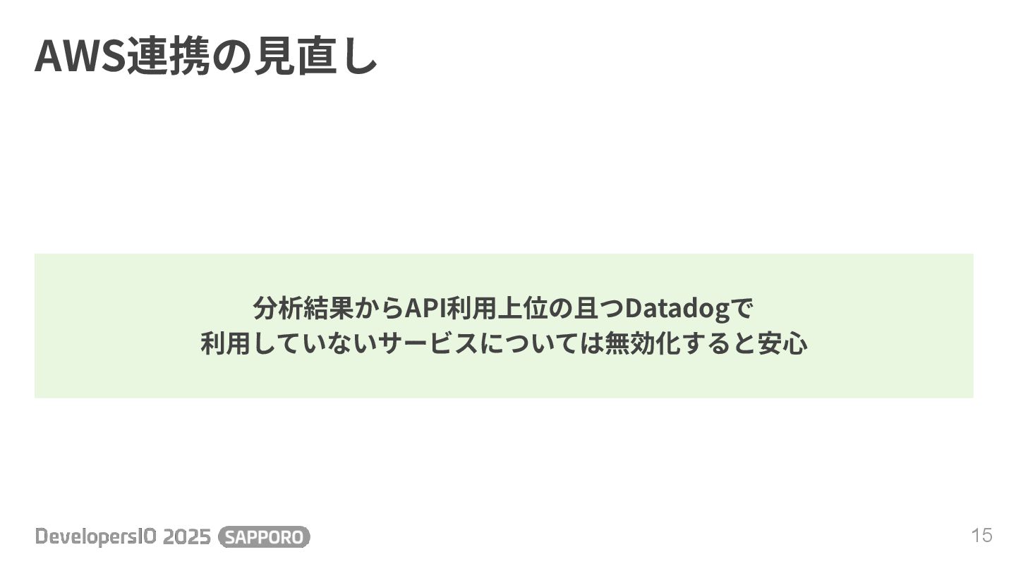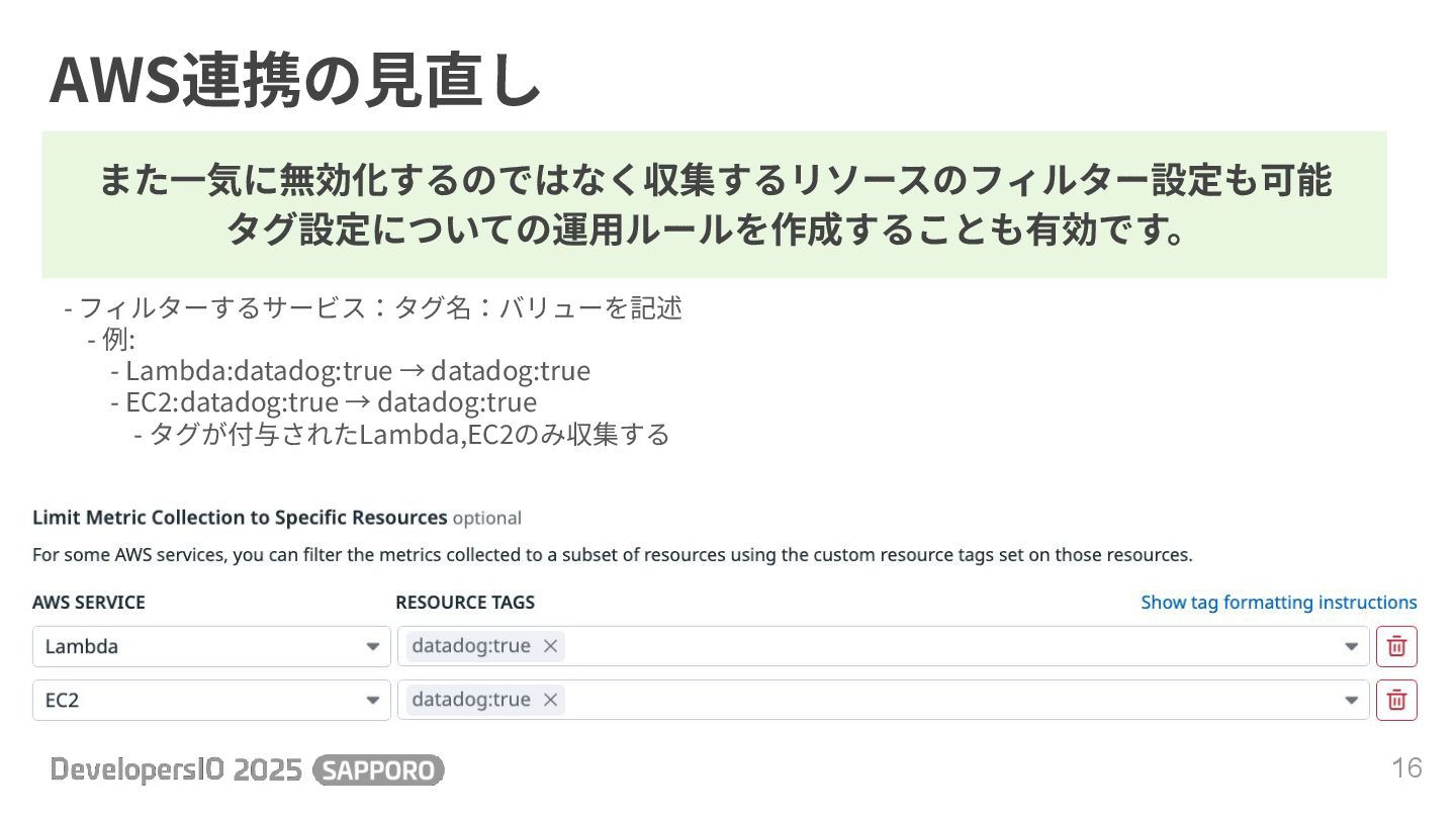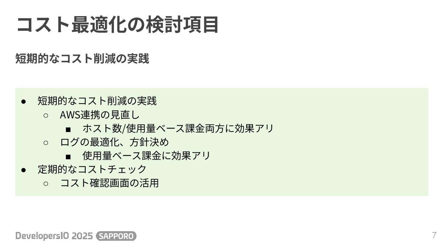 Datadogへの取り込み後に、インデックス化を停⽌する除外フィルターを設定することで、使⽤量を減らすことがで きます。 ◦ ログパターン機能を使⽤して、⼤量のログをグループ化して識別し、そのパターンに対して除外フィルターを追加す るのが効果的です。 ◦ Metrics Without Limits™やログベースのメトリクスを使⽤すれば、除外フィルターでインデックス化を停⽌したログ についても傾向や異常を可視化できます。 2. 適切なインデックス化の実施 ◦ まずは公式のベストプラクティスに従い、適切なインデックス化を⾏うことが重要です