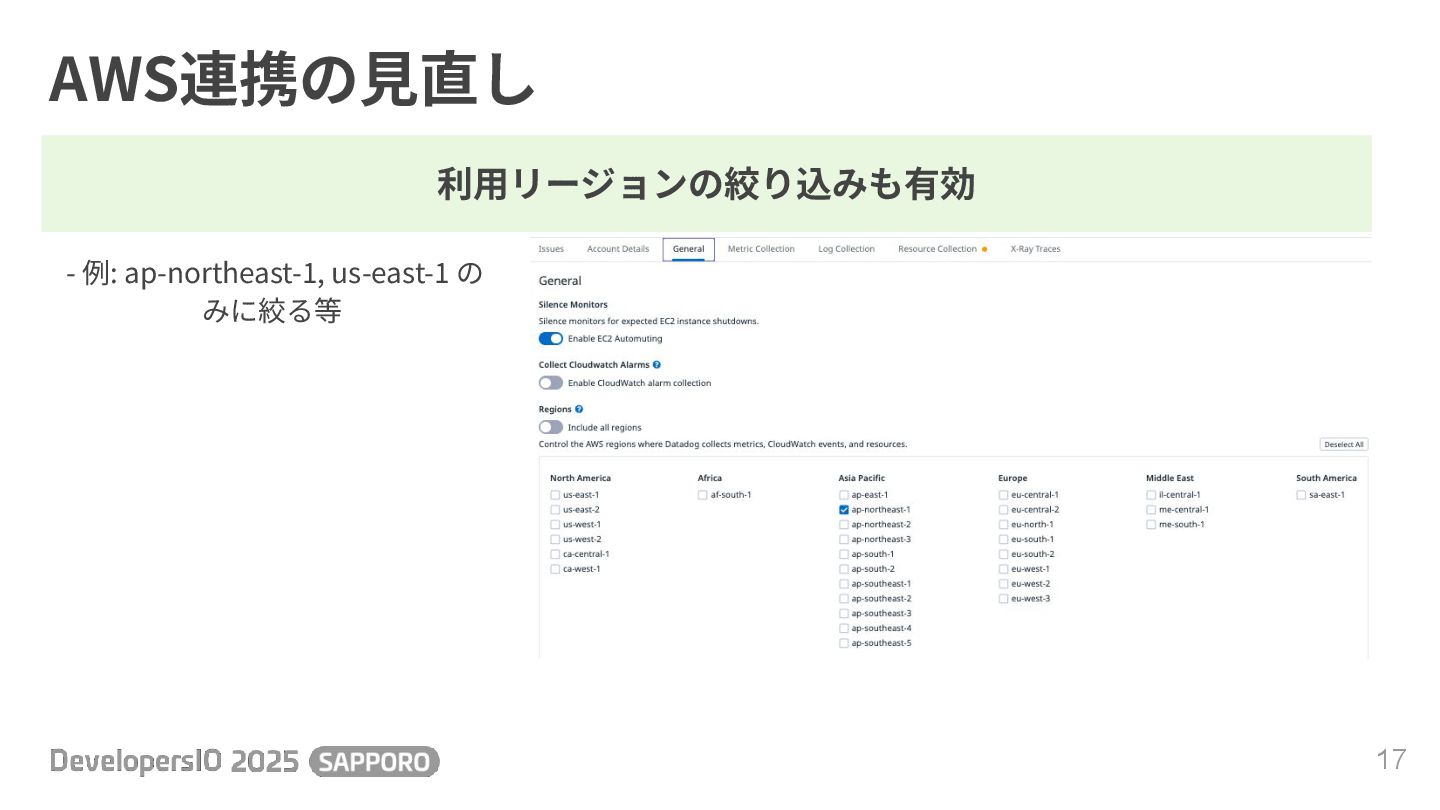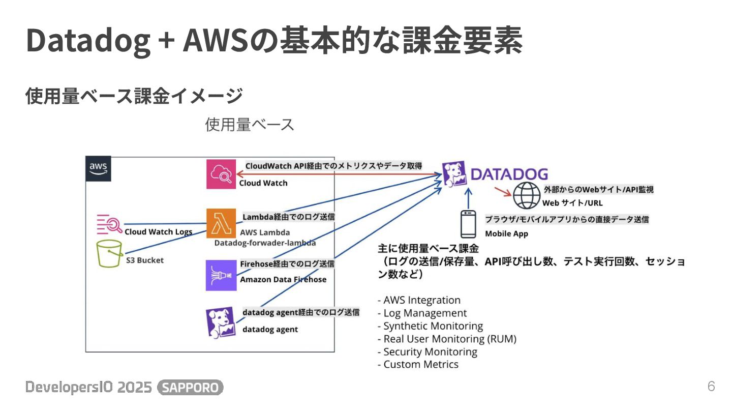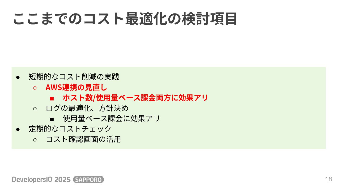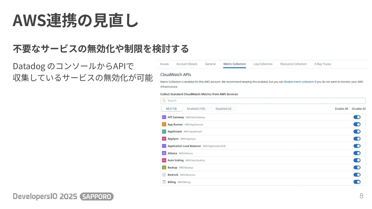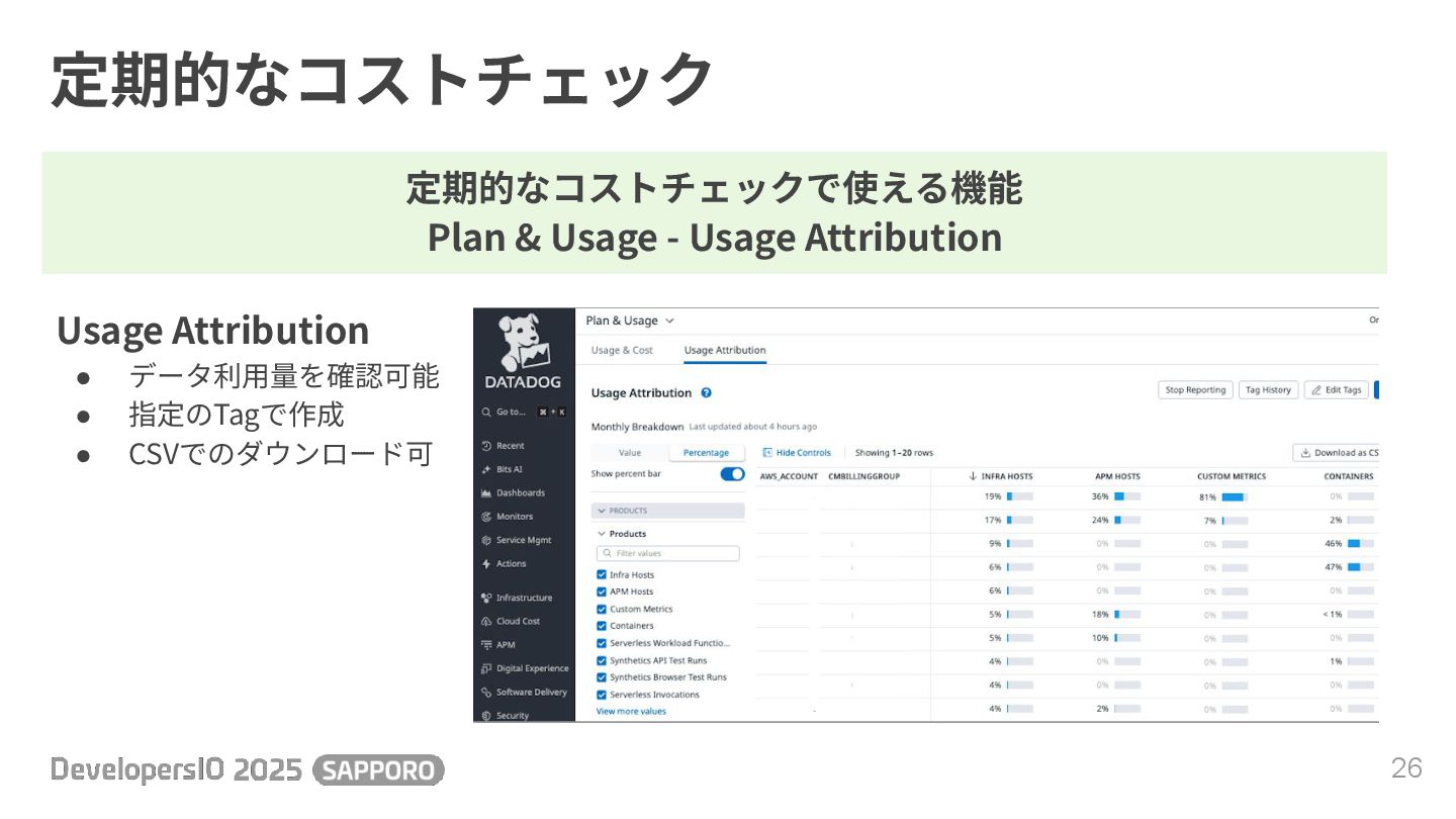 Datadogへの取り込み後に、インデックス化を停⽌する除外フィルターを設定することで、使⽤量を減らすことがで きます。 ◦ ログパターン機能を使⽤して、⼤量のログをグループ化して識別し、そのパターンに対して除外フィルターを追加す るのが効果的です。 ◦ Metrics Without Limits™やログベースのメトリクスを使⽤すれば、除外フィルターでインデックス化を停⽌したログ についても傾向や異常を可視化できます。 2. 適切なインデックス化の実施 ◦ まずは公式のベストプラクティスに従い、適切なインデックス化を⾏うことが重要です