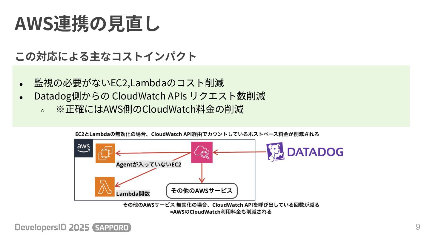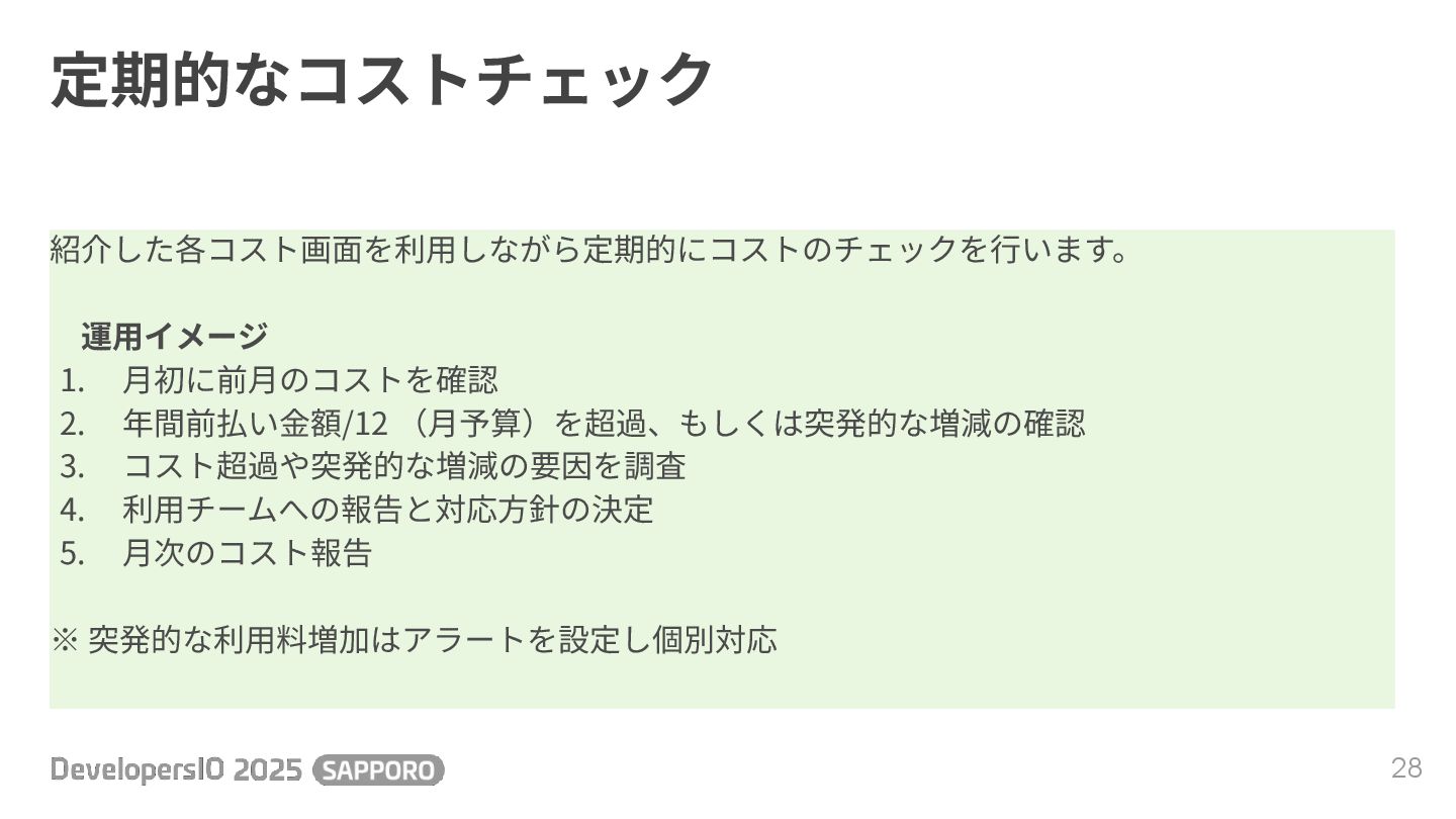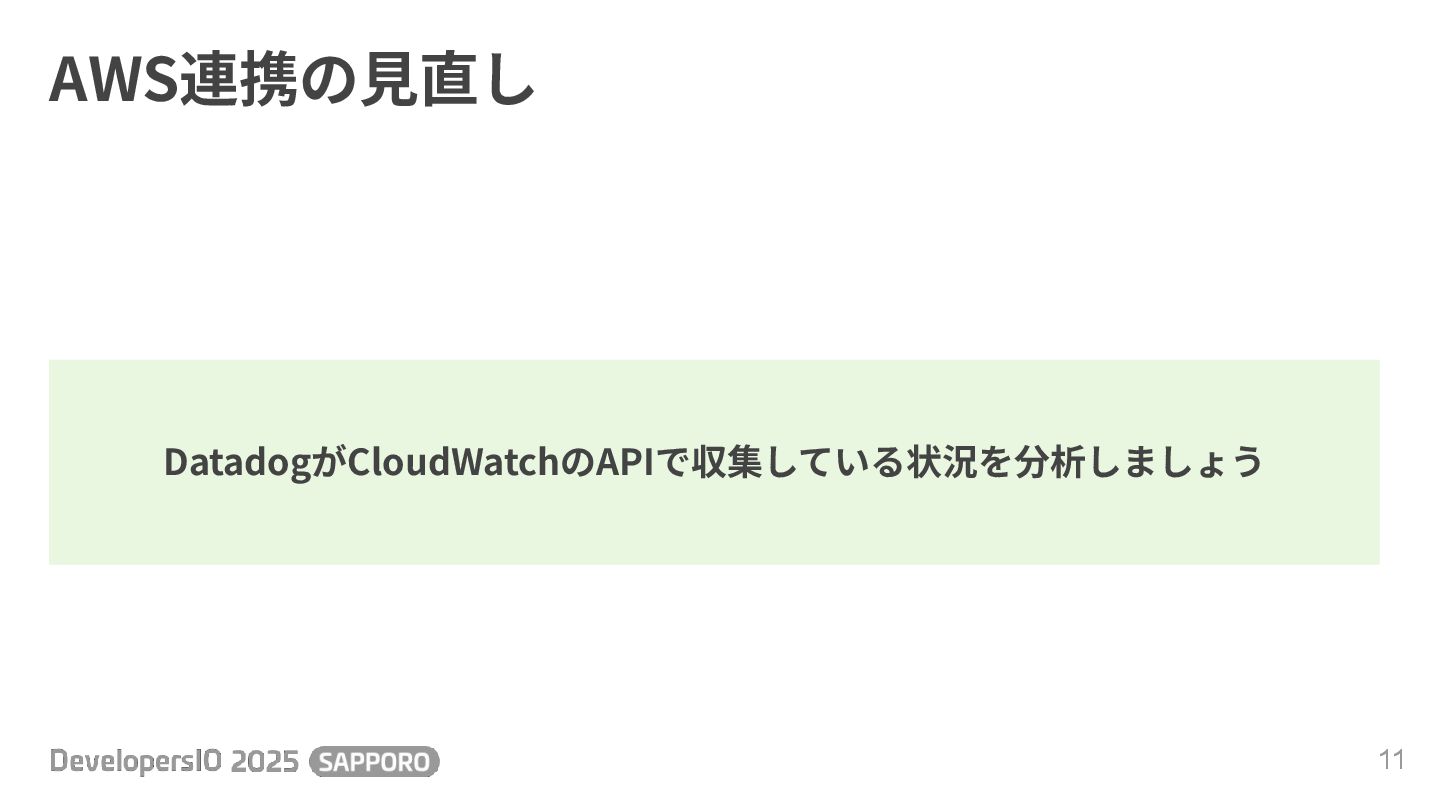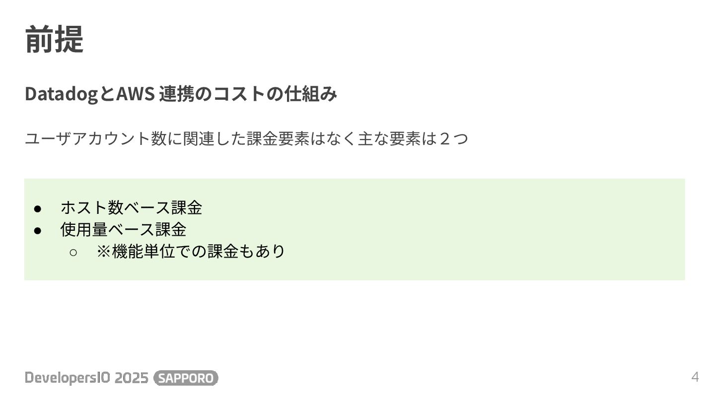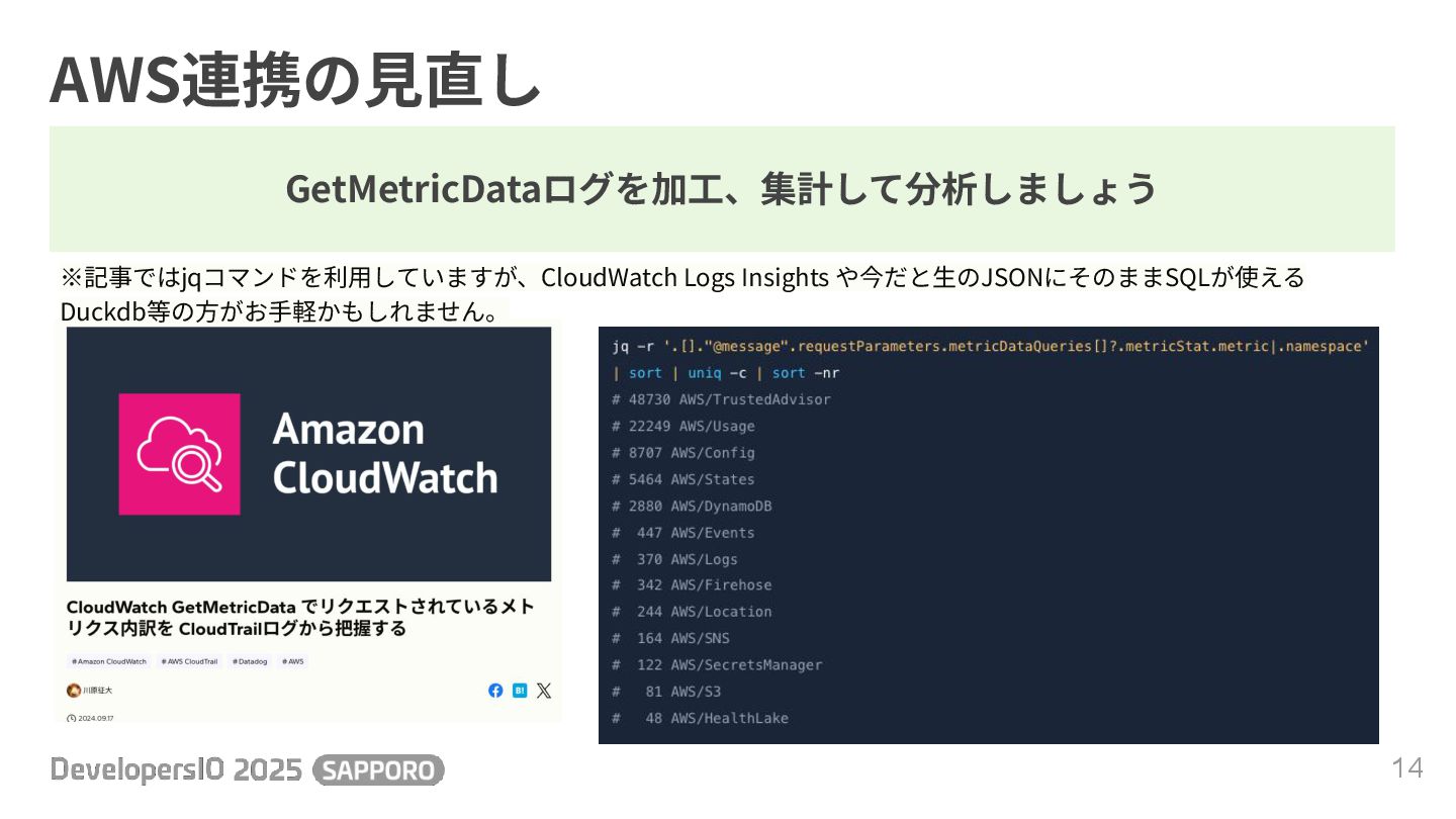 Datadogへの取り込み後に、インデックス化を停⽌する除外フィルターを設定することで、使⽤量を減らすことがで きます。 ◦ ログパターン機能を使⽤して、⼤量のログをグループ化して識別し、そのパターンに対して除外フィルターを追加す るのが効果的です。 ◦ Metrics Without Limits™やログベースのメトリクスを使⽤すれば、除外フィルターでインデックス化を停⽌したログ についても傾向や異常を可視化できます。 2. 適切なインデックス化の実施 ◦ まずは公式のベストプラクティスに従い、適切なインデックス化を⾏うことが重要です