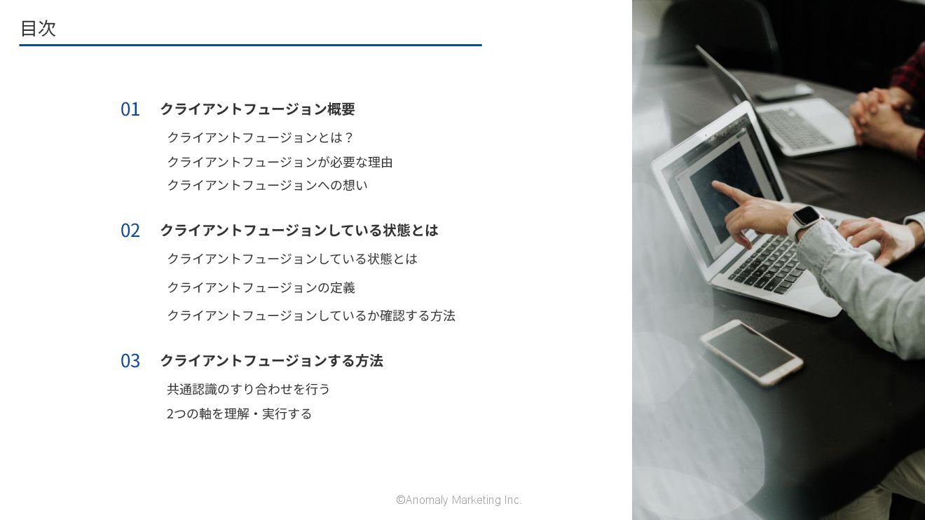 ©Anomaly Marketing Inc. ⽬次 03 クライアントフュージョンする⽅法 2つの軸を理解‧実⾏する 共通認識のすり合わせを⾏う 02 クライアントフュージョンしている状態とは