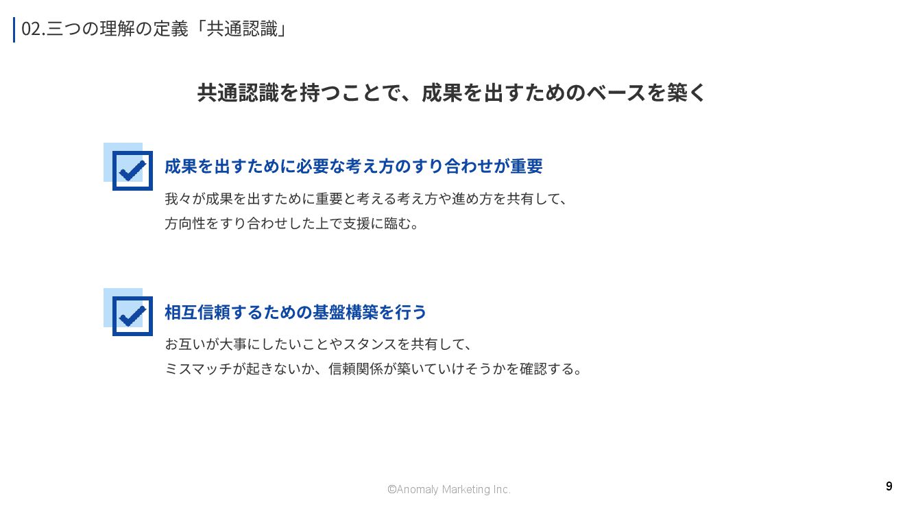 ©Anomaly Marketing Inc. お互いが⼤事にしたいことやスタンスを共有して、 ミスマッチが起きないか、信頼関係が築いていけそうかを確認する。 相互信頼するための基盤構築を⾏う 我々が成果を出すために重要と考える考え⽅や進め⽅を共有して、 ⽅向性をすり合わせした上で⽀援に臨む。 成果を出すために必要な考え⽅のすり合わせが重要 02.三つの理解の定義「共通認識」
