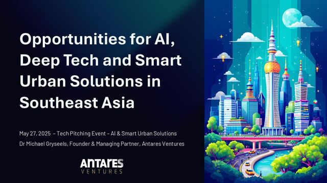 Presentation by Michael Gryseels (Founder and Managing Partner of Antares Ventures) at the AI x Smart Urban Solutions Tech Pitch and Networking event in Singapore, co-hosted by Austrade and SGInnovate (May 2025).