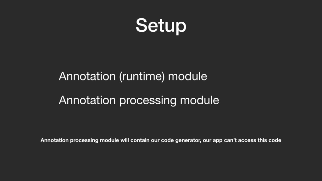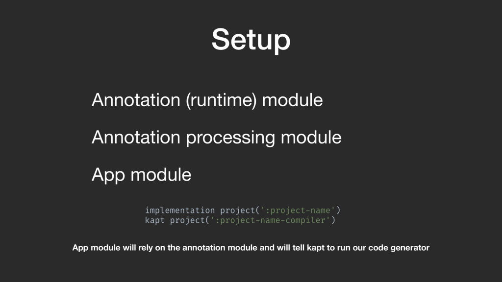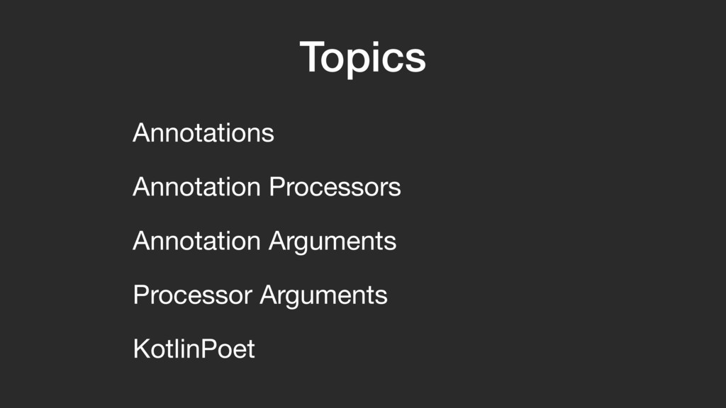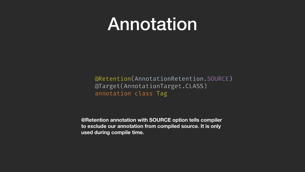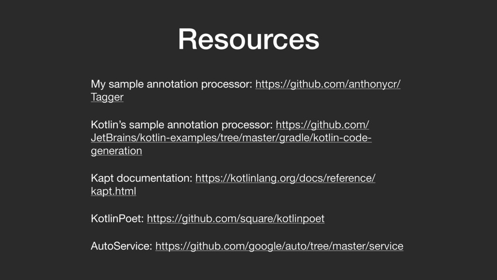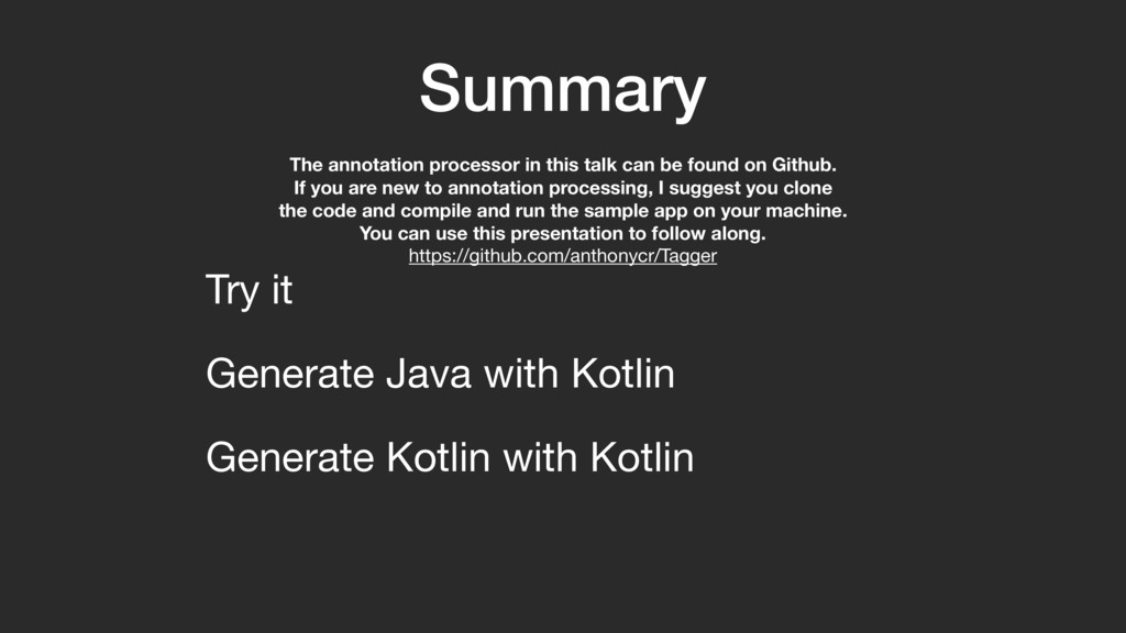 Kotlin The annotation processor in this talk can be found on Github. If you are new to annotation processing, I suggest you clone the code and compile and run the sample app on your machine. You can use this presentation to follow along. https://github.com/anthonycr/Tagger