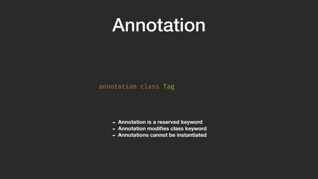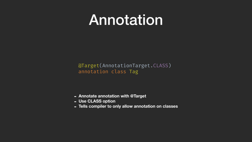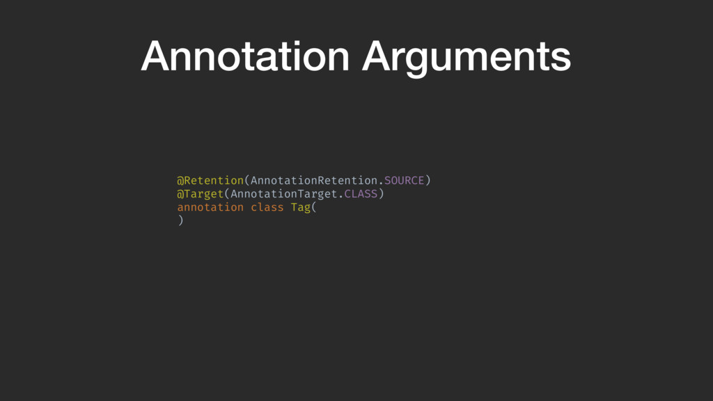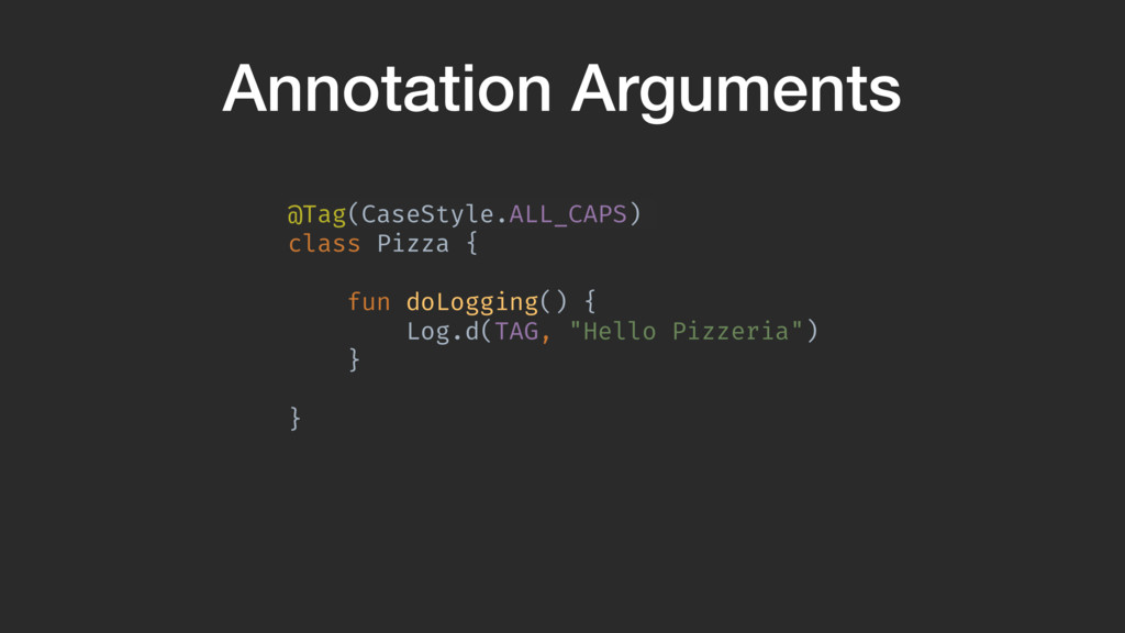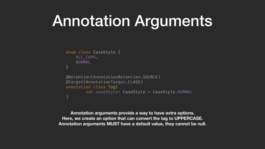 @Target(AnnotationTarget.CLASS) annotation class Tag( val caseStyle: CaseStyle = CaseStyle.NORMAL )A Annotation arguments provide a way to have extra options. Here, we create an option that can convert the tag to UPPERCASE. Annotation arguments MUST have a default value, they cannot be null.