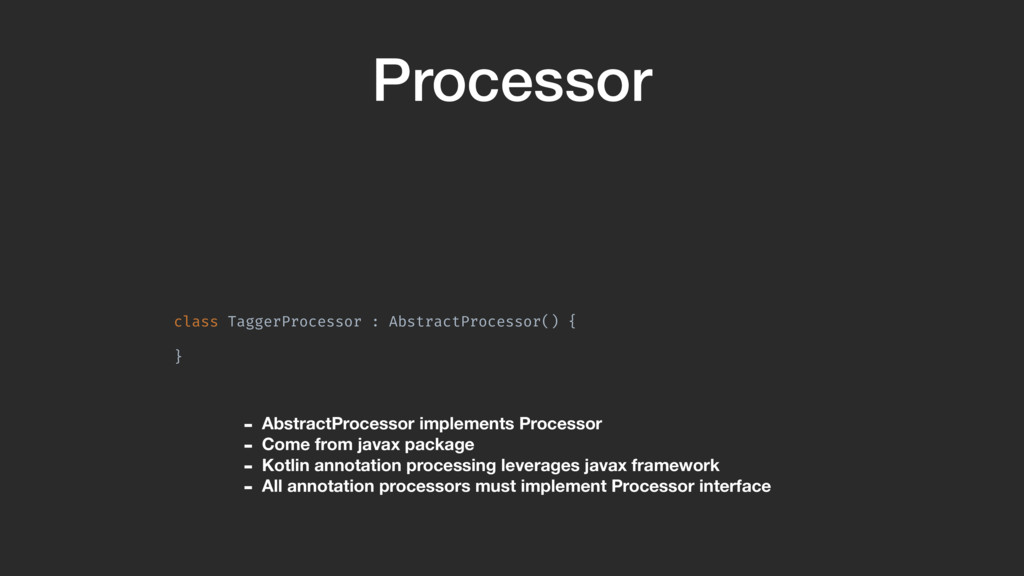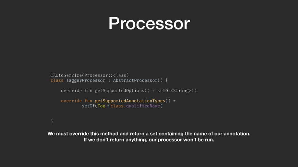= setOf<String>() override fun getSupportedAnnotationTypes() = setOf(Tag!::class.qualifiedName) }A We must override this method and return a set containing the name of our annotation. If we don’t return anything, our processor won’t be run.