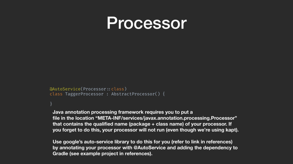 processing framework requires you to put a file in the location “META-INF/services/javax.annotation.processing.Processor” that contains the qualified name (package + class name) of your processor. If you forget to do this, your processor will not run (even though we’re using kapt). Use google’s auto-service library to do this for you (refer to link in references) by annotating your processor with @AutoService and adding the dependency to Gradle (see example project in references).