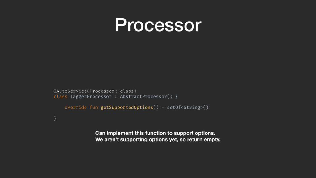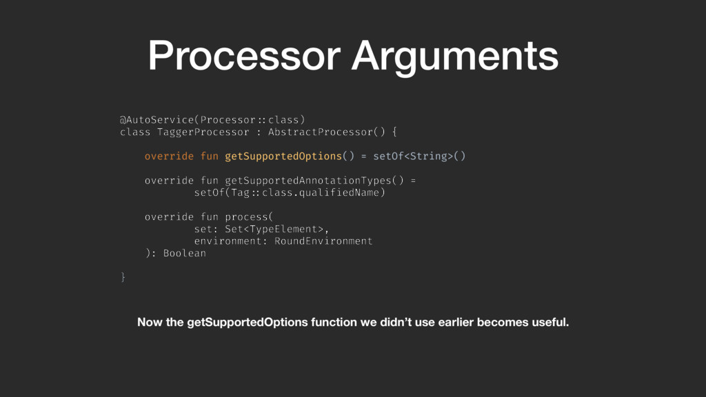 getSupportedOptions() = setOf<String>() override fun getSupportedAnnotationTypes() = setOf(Tag!::class.qualifiedName) override fun process( set: Set<TypeElement>, environment: RoundEnvironment ): Boolean }A Now the getSupportedOptions function we didn’t use earlier becomes useful.
