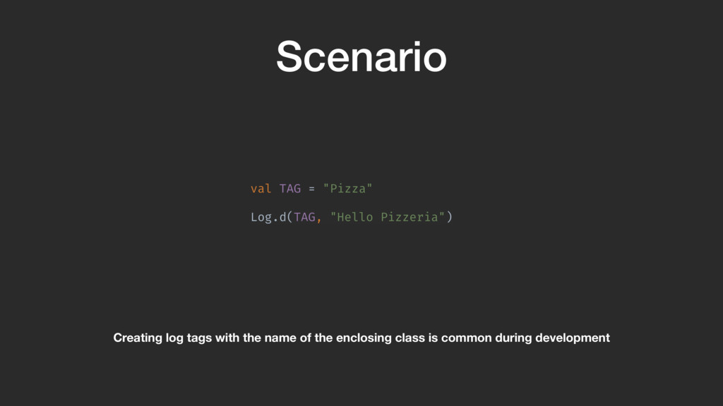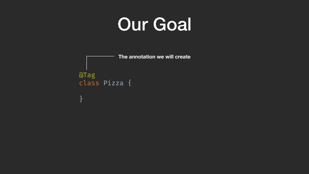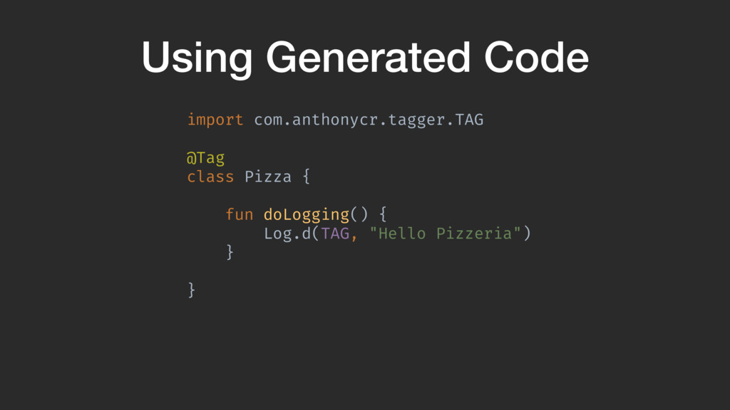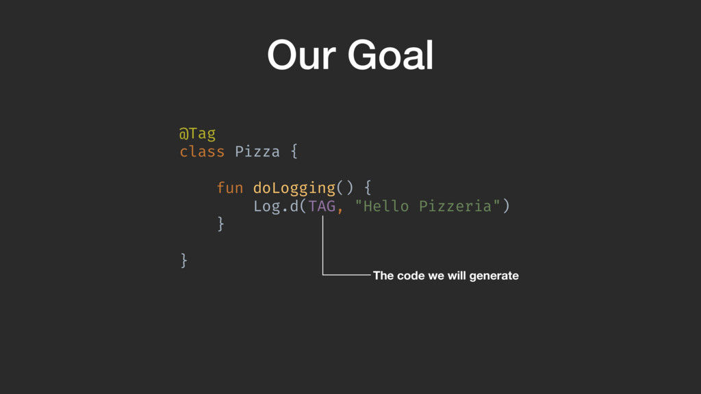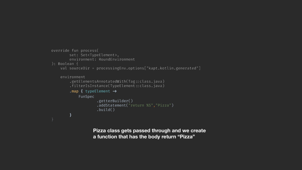 val sourceDir = processingEnv.options["kapt.kotlin.generated"] environment .getElementsAnnotatedWith(Tag!::class.java) .filterIsInstance(TypeElement!::class.java) .map { typeElement !-> FunSpec .getterBuilder() .addStatement("return %S","Pizza") .build()AB }A }Z Pizza class gets passed through and we create a function that has the body return “Pizza”