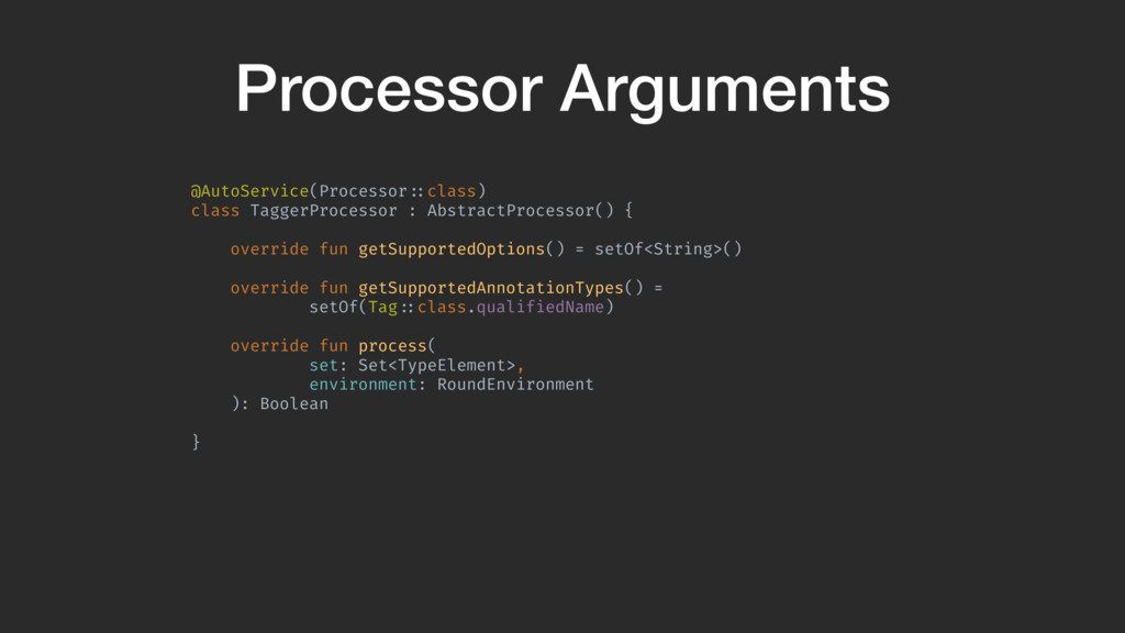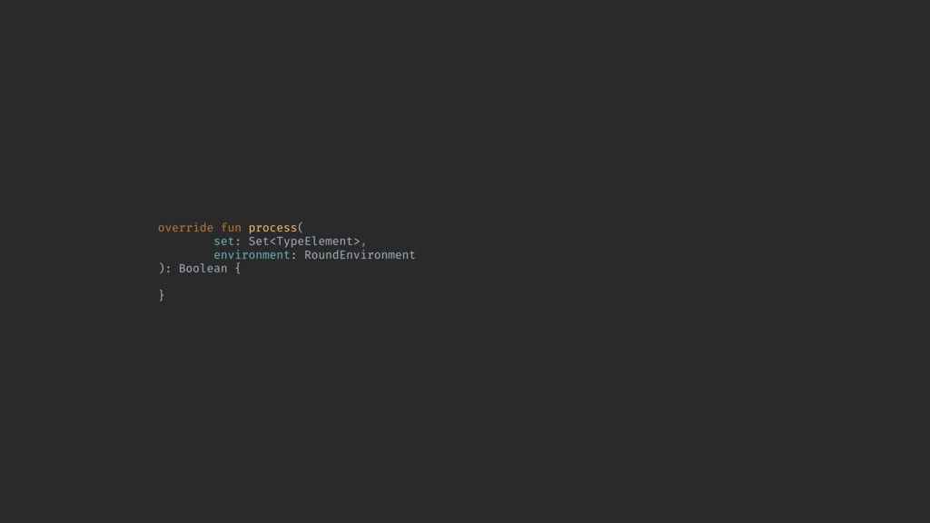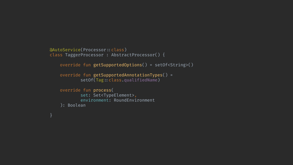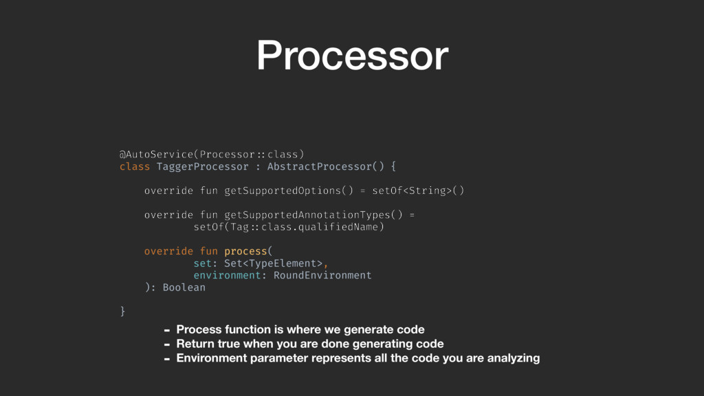 = setOf<String>() override fun getSupportedAnnotationTypes() = setOf(Tag!::class.qualifiedName) override fun process( set: Set<TypeElement>, environment: RoundEnvironment ): Boolean }A - Process function is where we generate code - Return true when you are done generating code - Environment parameter represents all the code you are analyzing