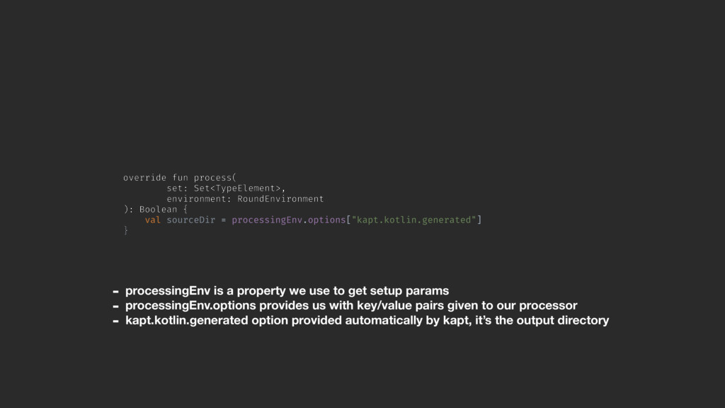 val sourceDir = processingEnv.options["kapt.kotlin.generated"] }Z - processingEnv is a property we use to get setup params - processingEnv.options provides us with key/value pairs given to our processor - kapt.kotlin.generated option provided automatically by kapt, it’s the output directory