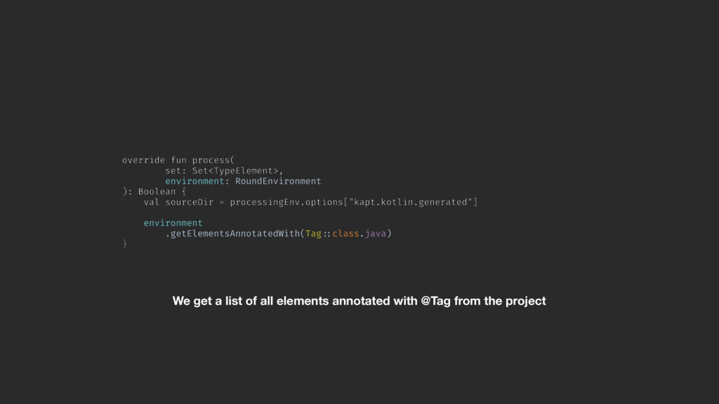 val sourceDir = processingEnv.options["kapt.kotlin.generated"] environment .getElementsAnnotatedWith(Tag!::class.java) }Z We get a list of all elements annotated with @Tag from the project