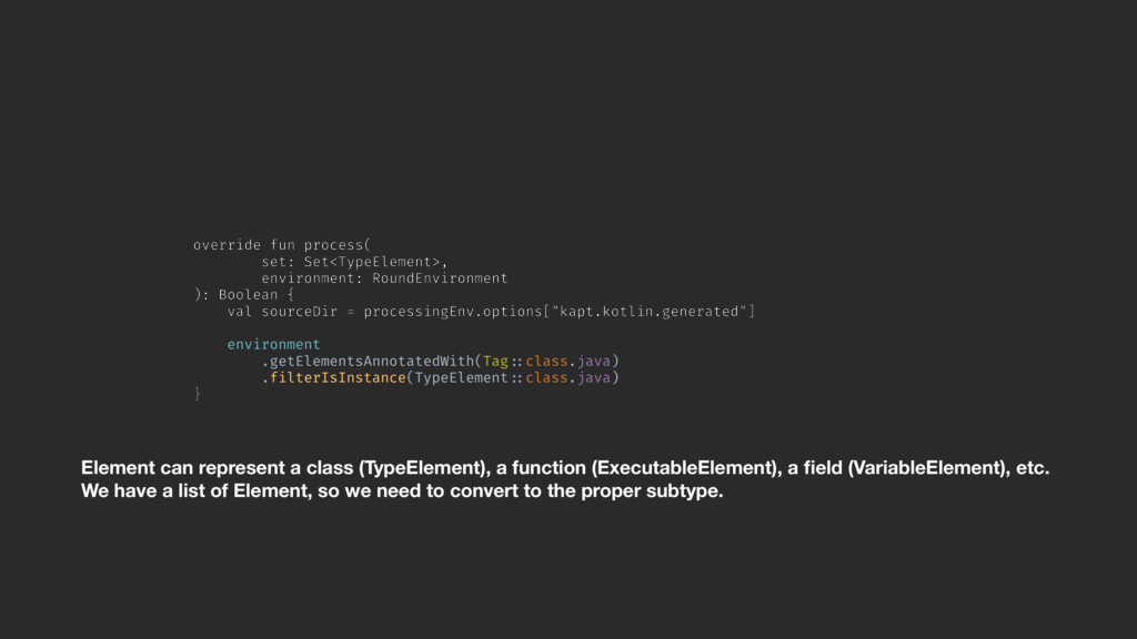 val sourceDir = processingEnv.options["kapt.kotlin.generated"] environment .getElementsAnnotatedWith(Tag!::class.java) .filterIsInstance(TypeElement!::class.java) }Z Element can represent a class (TypeElement), a function (ExecutableElement), a field (VariableElement), etc. We have a list of Element, so we need to convert to the proper subtype.
