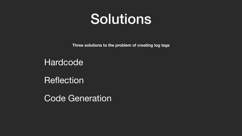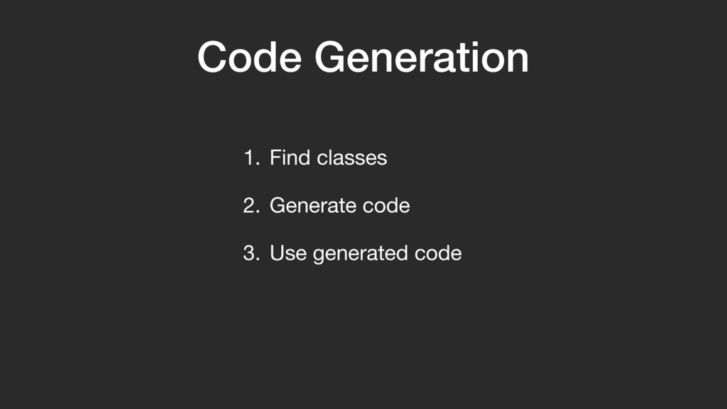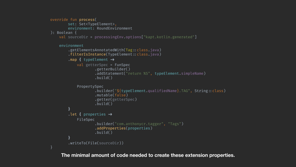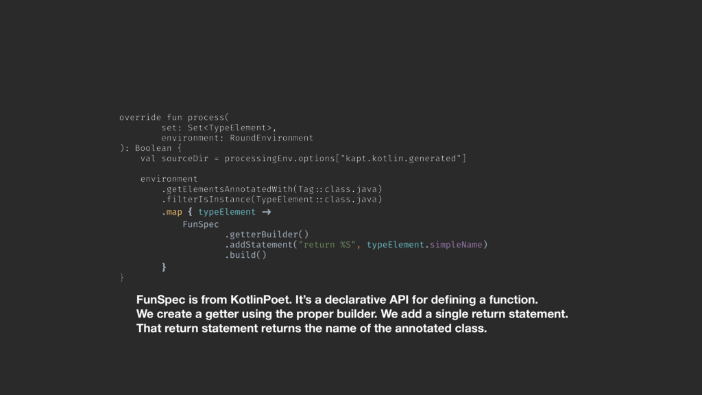 val sourceDir = processingEnv.options["kapt.kotlin.generated"] environment .getElementsAnnotatedWith(Tag!::class.java) .filterIsInstance(TypeElement!::class.java) .map { typeElement !-> FunSpec .getterBuilder() .addStatement("return %S", typeElement.simpleName) .build()AB }A }Z FunSpec is from KotlinPoet. It’s a declarative API for defining a function. We create a getter using the proper builder. We add a single return statement. That return statement returns the name of the annotated class.