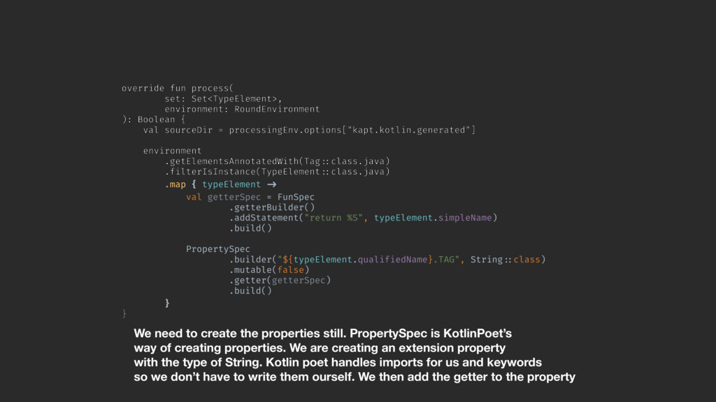 val sourceDir = processingEnv.options["kapt.kotlin.generated"] environment .getElementsAnnotatedWith(Tag!::class.java) .filterIsInstance(TypeElement!::class.java) .map { typeElement !-> val getterSpec = FunSpec .getterBuilder() .addStatement("return %S", typeElement.simpleName) .build()A PropertySpec .builder("${typeElement.qualifiedName}.TAG", String!::class) .mutable(false) .getter(getterSpec) .build()B }A }Z We need to create the properties still. PropertySpec is KotlinPoet’s way of creating properties. We are creating an extension property with the type of String. Kotlin poet handles imports for us and keywords so we don’t have to write them ourself. We then add the getter to the property