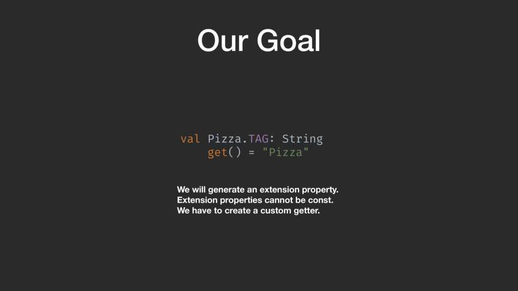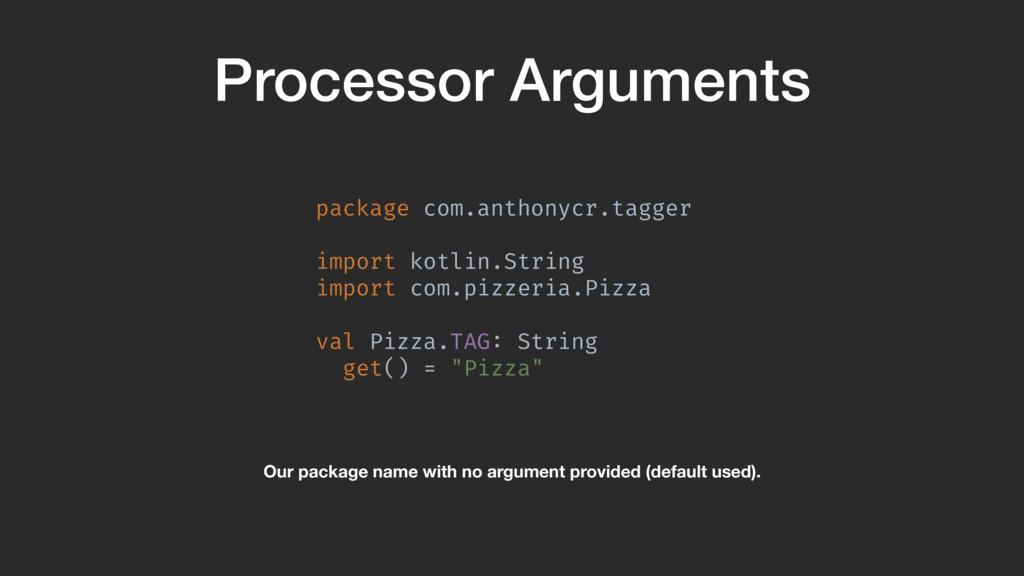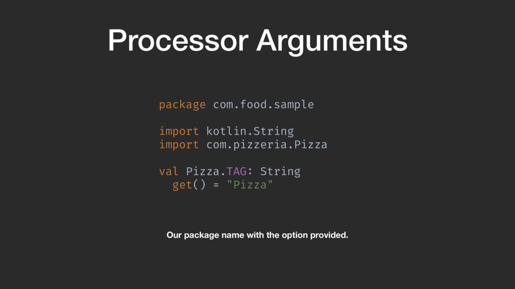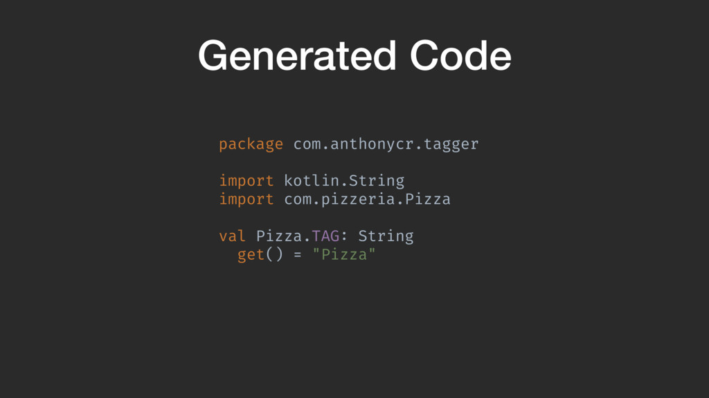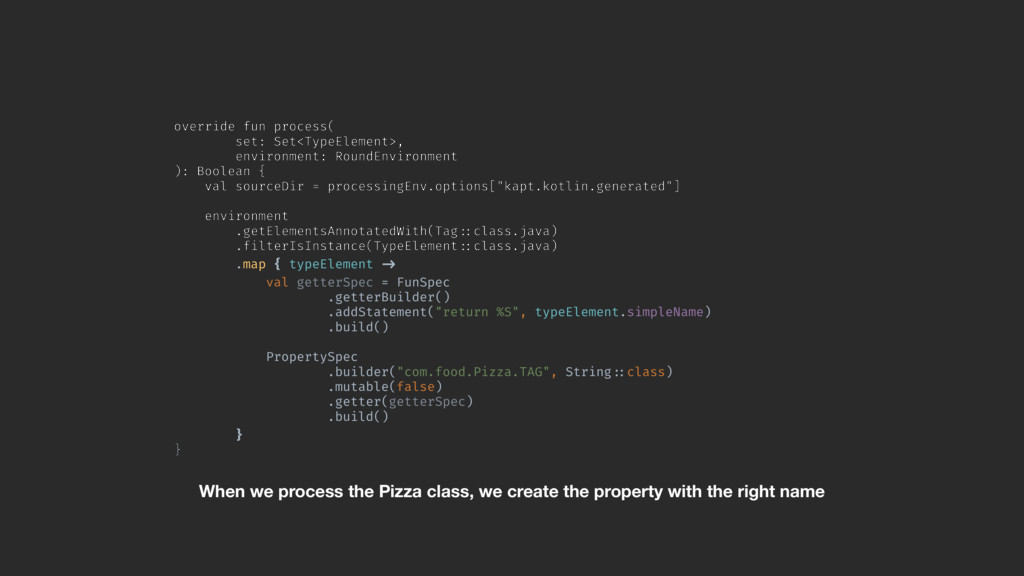 val sourceDir = processingEnv.options["kapt.kotlin.generated"] environment .getElementsAnnotatedWith(Tag!::class.java) .filterIsInstance(TypeElement!::class.java) .map { typeElement !-> val getterSpec = FunSpec .getterBuilder() .addStatement("return %S", typeElement.simpleName) .build()A PropertySpec .builder("com.food.Pizza.TAG", String!::class) .mutable(false) .getter(getterSpec) .build()B }A }Z When we process the Pizza class, we create the property with the right name