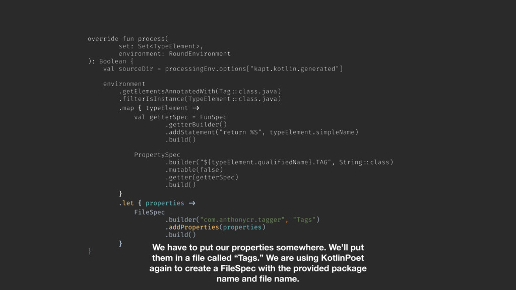 val sourceDir = processingEnv.options["kapt.kotlin.generated"] environment .getElementsAnnotatedWith(Tag!::class.java) .filterIsInstance(TypeElement!::class.java) .map { typeElement !-> val getterSpec = FunSpec .getterBuilder() .addStatement("return %S", typeElement.simpleName) .build()A PropertySpec .builder("${typeElement.qualifiedName}.TAG", String!::class) .mutable(false) .getter(getterSpec) .build()B }A .let { properties !-> FileSpec .builder("com.anthonycr.tagger", "Tags") .addProperties(properties) .build()C }B }Z We have to put our properties somewhere. We’ll put them in a file called “Tags.” We are using KotlinPoet again to create a FileSpec with the provided package name and file name.