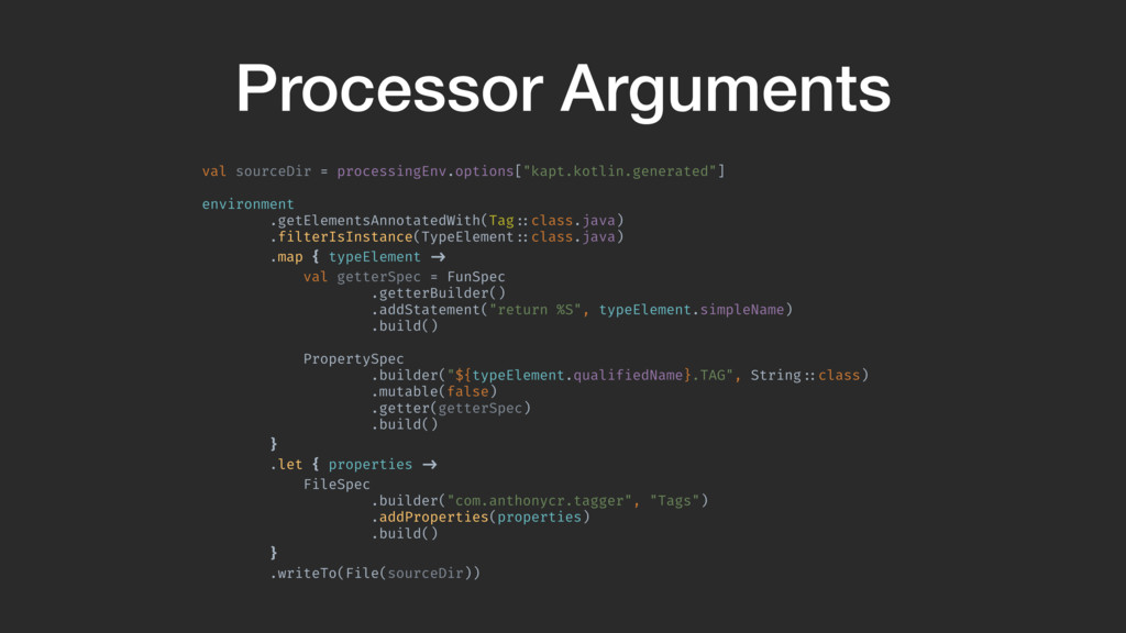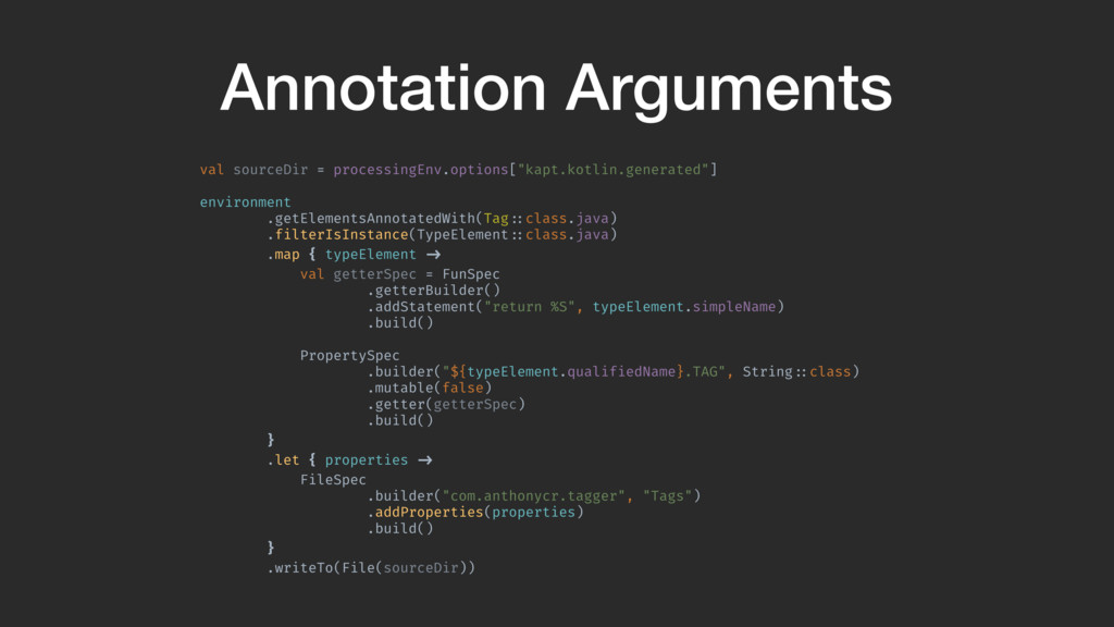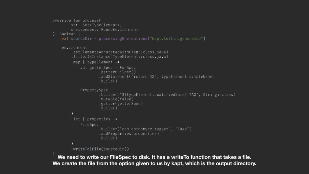 val sourceDir = processingEnv.options["kapt.kotlin.generated"] environment .getElementsAnnotatedWith(Tag!::class.java) .filterIsInstance(TypeElement!::class.java) .map { typeElement !-> val getterSpec = FunSpec .getterBuilder() .addStatement("return %S", typeElement.simpleName) .build()A PropertySpec .builder("${typeElement.qualifiedName}.TAG", String!::class) .mutable(false) .getter(getterSpec) .build()B }A .let { properties !-> FileSpec .builder("com.anthonycr.tagger", "Tags") .addProperties(properties) .build()C }B .writeTo(File(sourceDir)) }Z We need to write our FileSpec to disk. It has a writeTo function that takes a file. We create the file from the option given to us by kapt, which is the output directory.