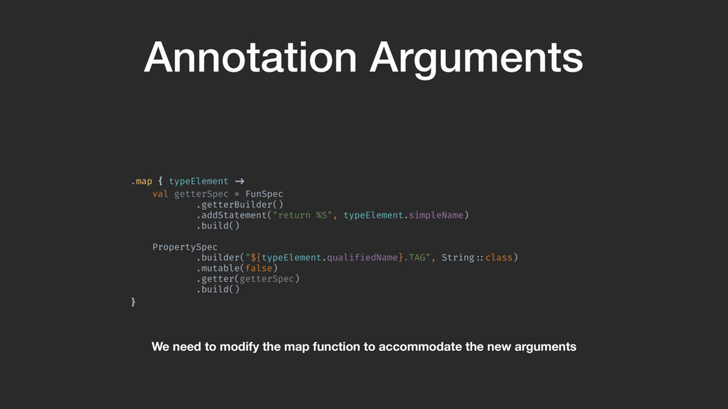 .getterBuilder() .addStatement("return %S", typeElement.simpleName) .build()A PropertySpec .builder("${typeElement.qualifiedName}.TAG", String!::class) .mutable(false) .getter(getterSpec) .build()B }A We need to modify the map function to accommodate the new arguments