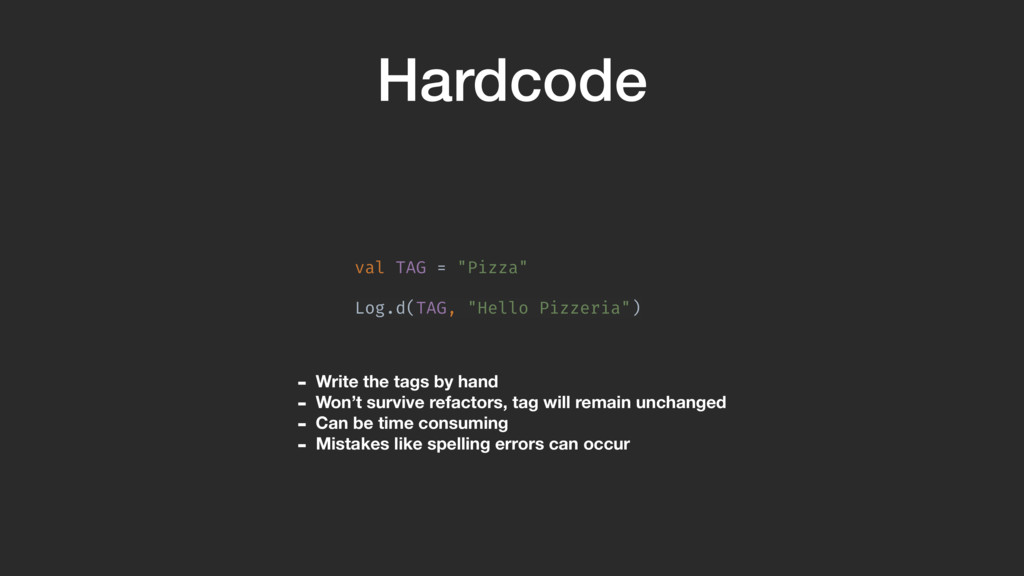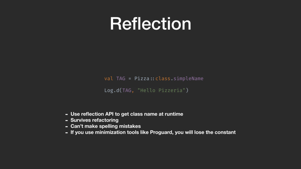 reflection API to get class name at runtime - Survives refactoring - Can’t make spelling mistakes - If you use minimization tools like Proguard, you will lose the constant