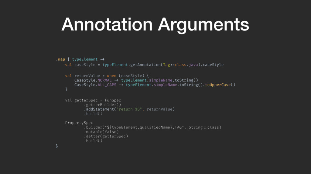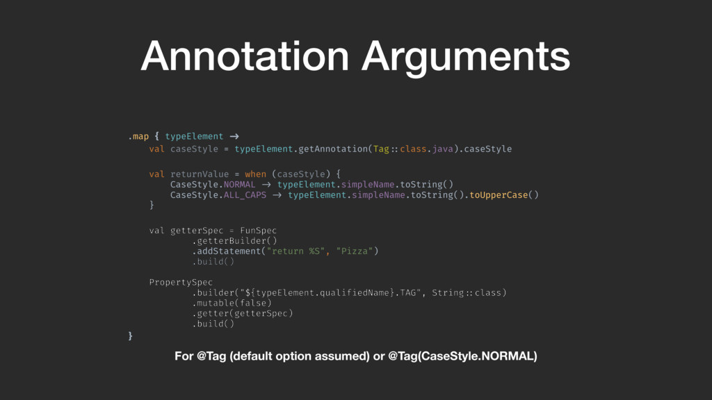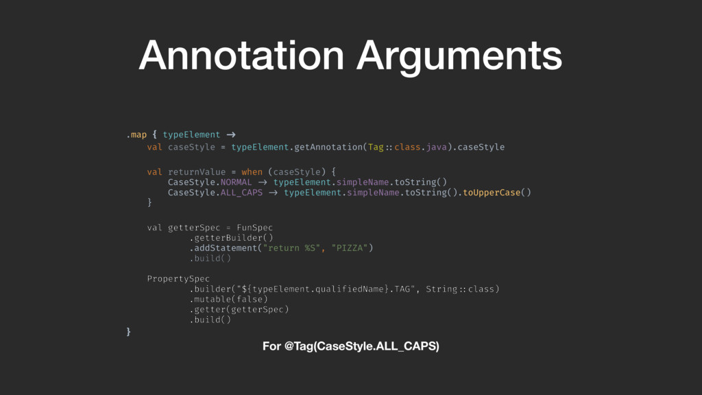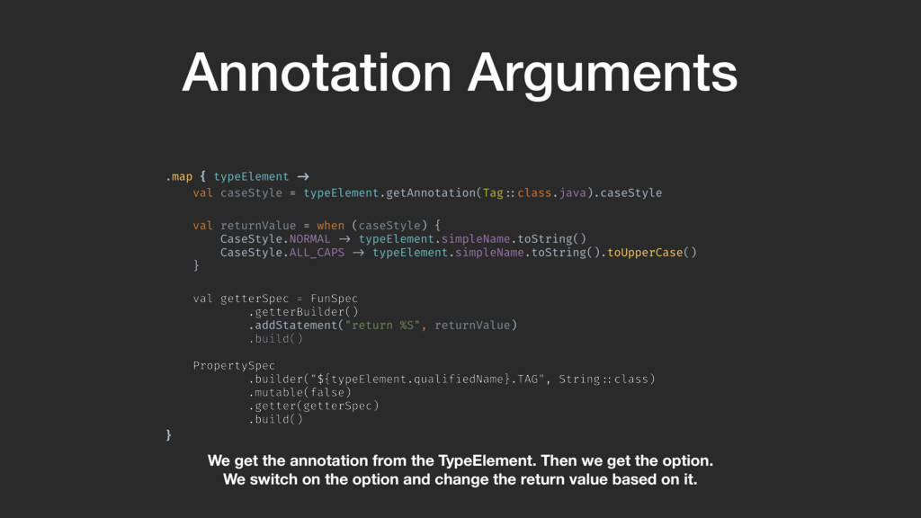 val returnValue = when (caseStyle) { CaseStyle.NORMAL !-> typeElement.simpleName.toString() CaseStyle.ALL_CAPS !-> typeElement.simpleName.toString().toUpperCase() } val getterSpec = FunSpec .getterBuilder() .addStatement("return %S", returnValue) .build()A PropertySpec .builder("${typeElement.qualifiedName}.TAG", String!::class) .mutable(false) .getter(getterSpec) .build()B }A We get the annotation from the TypeElement. Then we get the option. We switch on the option and change the return value based on it.
