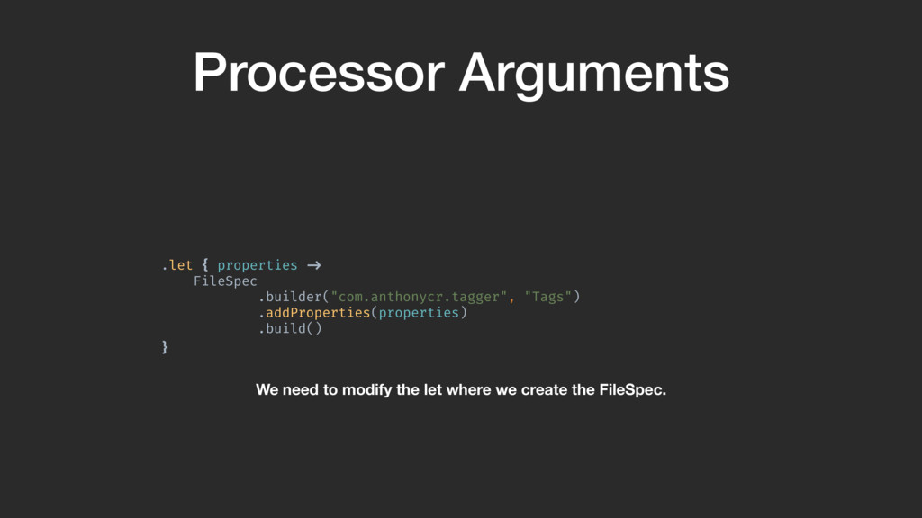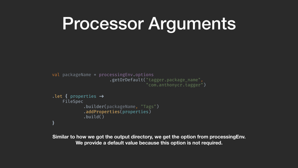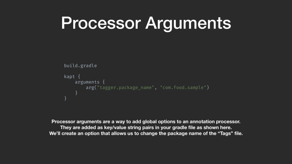 } Processor arguments are a way to add global options to an annotation processor. They are added as key/value string pairs in your gradle file as shown here. We’ll create an option that allows us to change the package name of the “Tags” file.