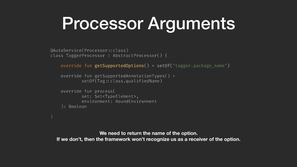 getSupportedOptions() = setOf("tagger.package_name") override fun getSupportedAnnotationTypes() = setOf(Tag!::class.qualifiedName) override fun process( set: Set<TypeElement>, environment: RoundEnvironment ): Boolean }A We need to return the name of the option. If we don’t, then the framework won’t recognize us as a receiver of the option.