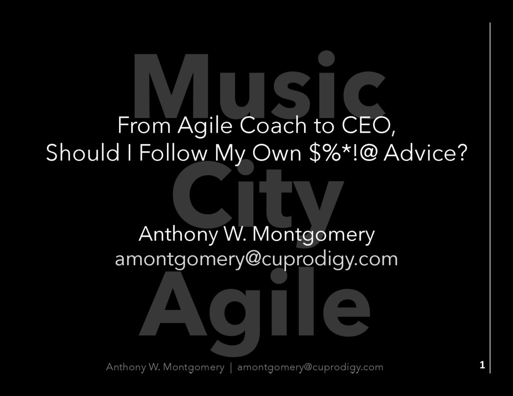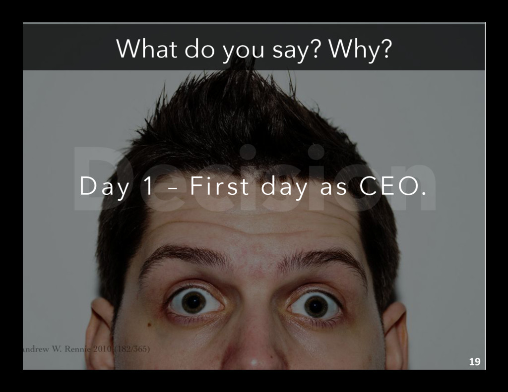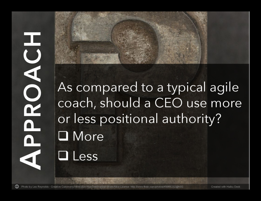 Creative Commons Attribution-NonCommercial-ShareAlike License http://www.flickr.com/photos/49968232@N00 Created with Haiku Deck APPROACH As compared to a typical agile coach, should a CEO use more or less positional authority? q More q Less