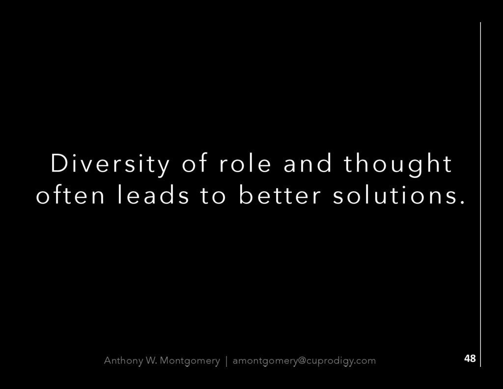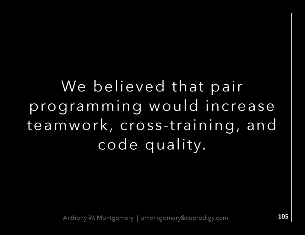 Payà Canals - Creative Commons Attribution-ShareAlike License https://www.flickr.com/photos/24630636@N03 Created with Haiku Deck 106 Intense collaboration is expensive but reduces risk (single threaded dependencies) by growing learning. Take away
