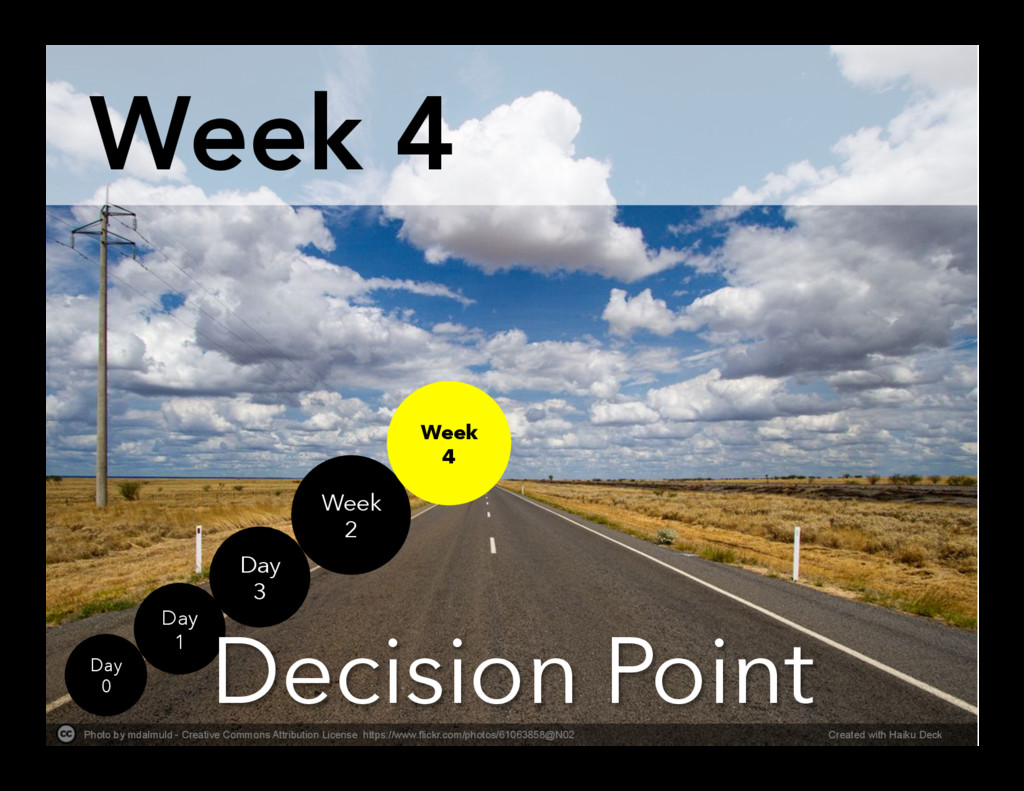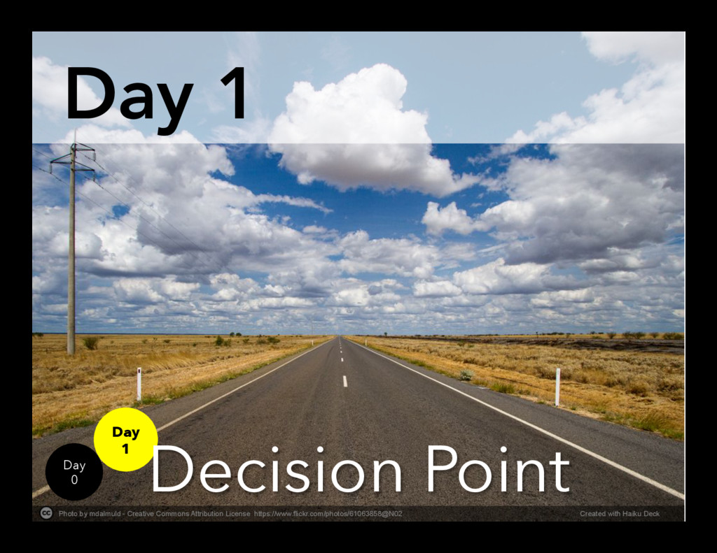 Commons Attribution License https://www.flickr.com/photos/61063858@N02 Created with Haiku Deck Month 4 Day 1 Day 3 Week 2 Week 4 Week 6 Month 2 Month 3 Month 4 Day 0 Decision Point