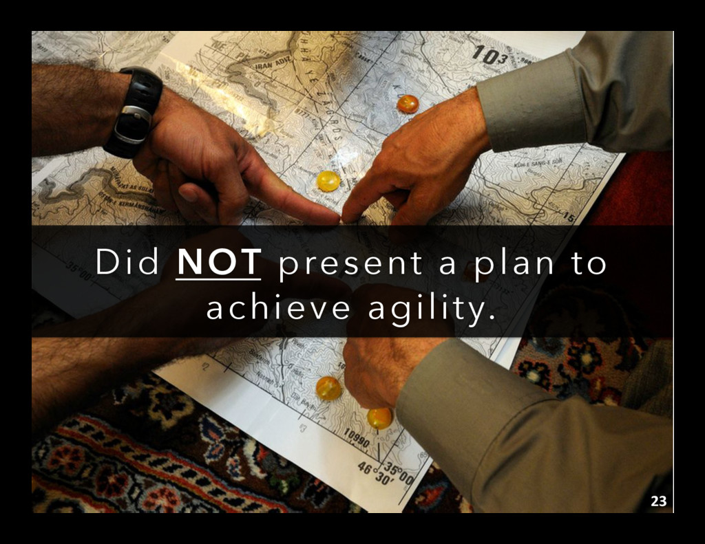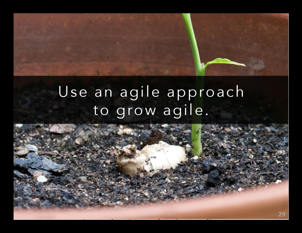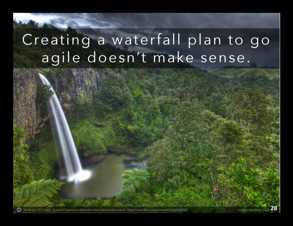 Creative Commons Attribution-NonCommercial License https://www.flickr.com/photos/42928188@N02 Created with Haiku Deck 28 Creating a waterfall plan to go agile doesn’t make sense.