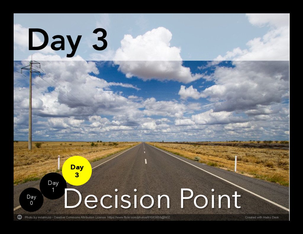 Commons Attribution License https://www.flickr.com/photos/61063858@N02 Created with Haiku Deck Month 3 Day 1 Day 3 Week 2 Week 4 Week 6 Month 2 Month 3 Day 0 Decision Point