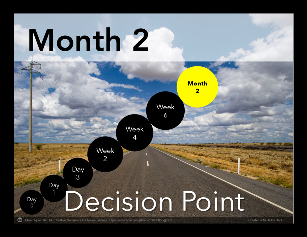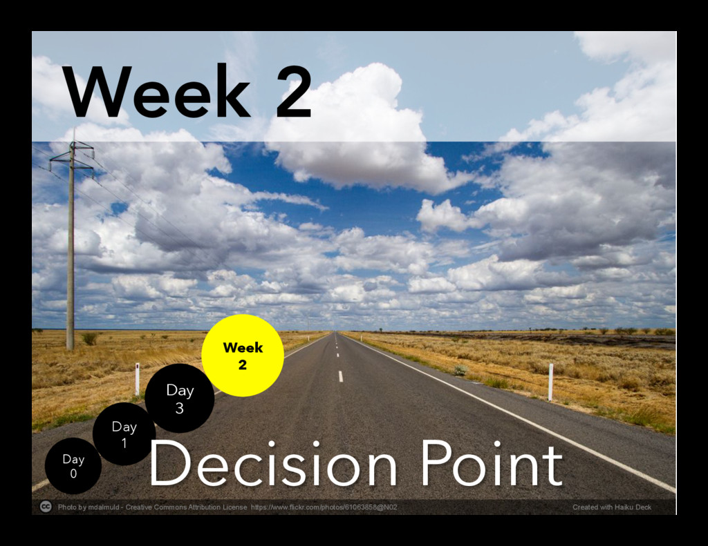 Commons Attribution License https://www.flickr.com/photos/61063858@N02 Created with Haiku Deck Month 2 Day 1 Day 3 Week 2 Week 4 Week 6 Month 2 Day 0 Decision Point