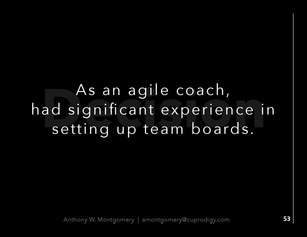 Creative Commons Attribution-NonCommercial-ShareAlike License http://www.flickr.com/photos/49968232@N00 Created with Haiku Deck WEEK 4 How should setup of team boards be approached? Hands On Hands Off Visualize Existing Process A B Change the Process C D