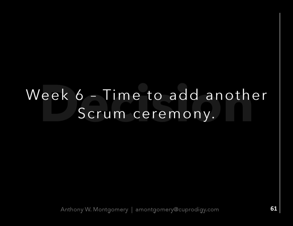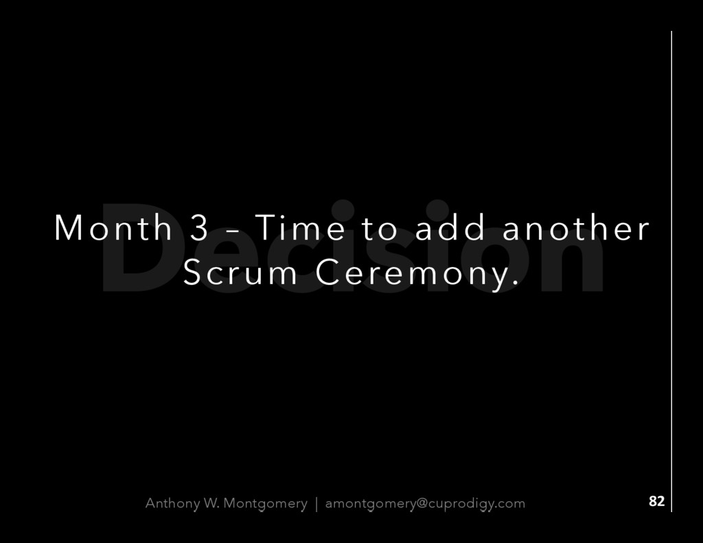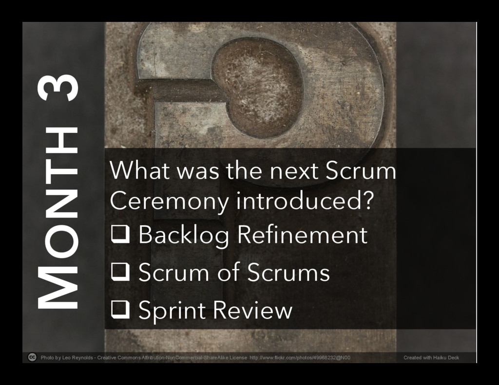 Creative Commons Attribution-NonCommercial-ShareAlike License http://www.flickr.com/photos/49968232@N00 Created with Haiku Deck MONTH 3 What was the next Scrum Ceremony introduced? q Backlog Refinement q Scrum of Scrums q Sprint Review