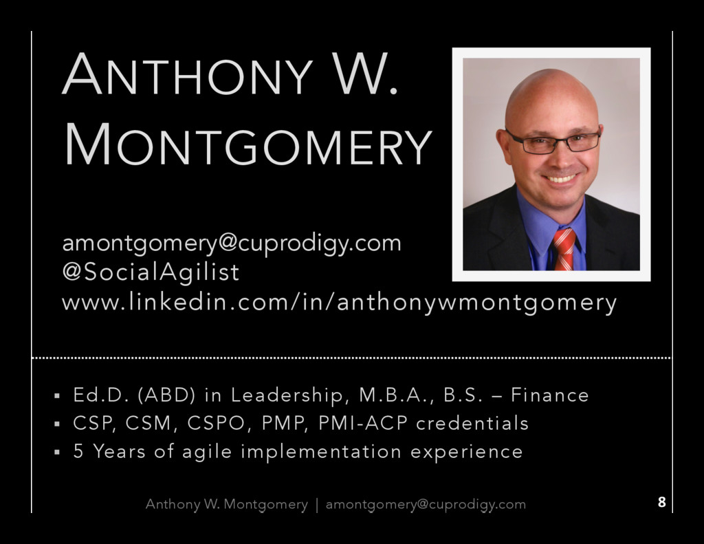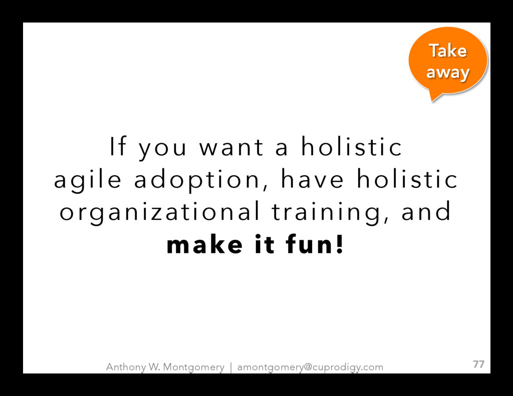 them always. 7. Have holistic training early. 8. Have lots of fun. 9. Start with frequent, structured, collaboration early; adjust as ad-hoc collaboration, and pairing, grows. 10. Use agile to grow agile; remember you are never done. 108