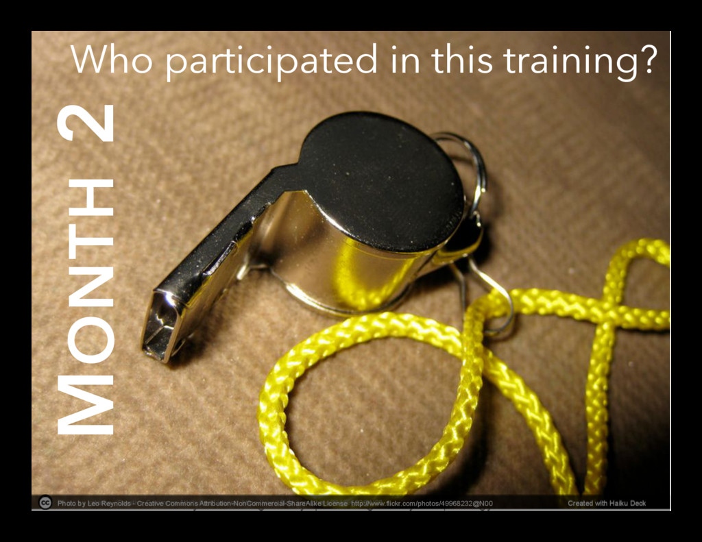 Commons Attribution License https://www.flickr.com/photos/8489692@N03 Created with Haiku Deck Photo by Leo Reynolds - Creative Commons Attribution-NonCommercial-ShareAlike License http://www.flickr.com/photos/49968232@N00 Created with Haiku Deck MONTH 2 Who participated in this training?