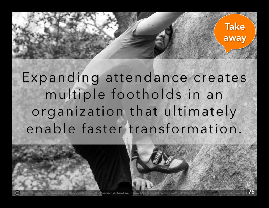 Commons Attribution-NonCommercial-ShareAlike License https://www.flickr.com/photos/35045382@N00 Created with Haiku Deck 76 Expanding attendance creates multiple footholds in an organization that ultimately enable faster transformation. Take away