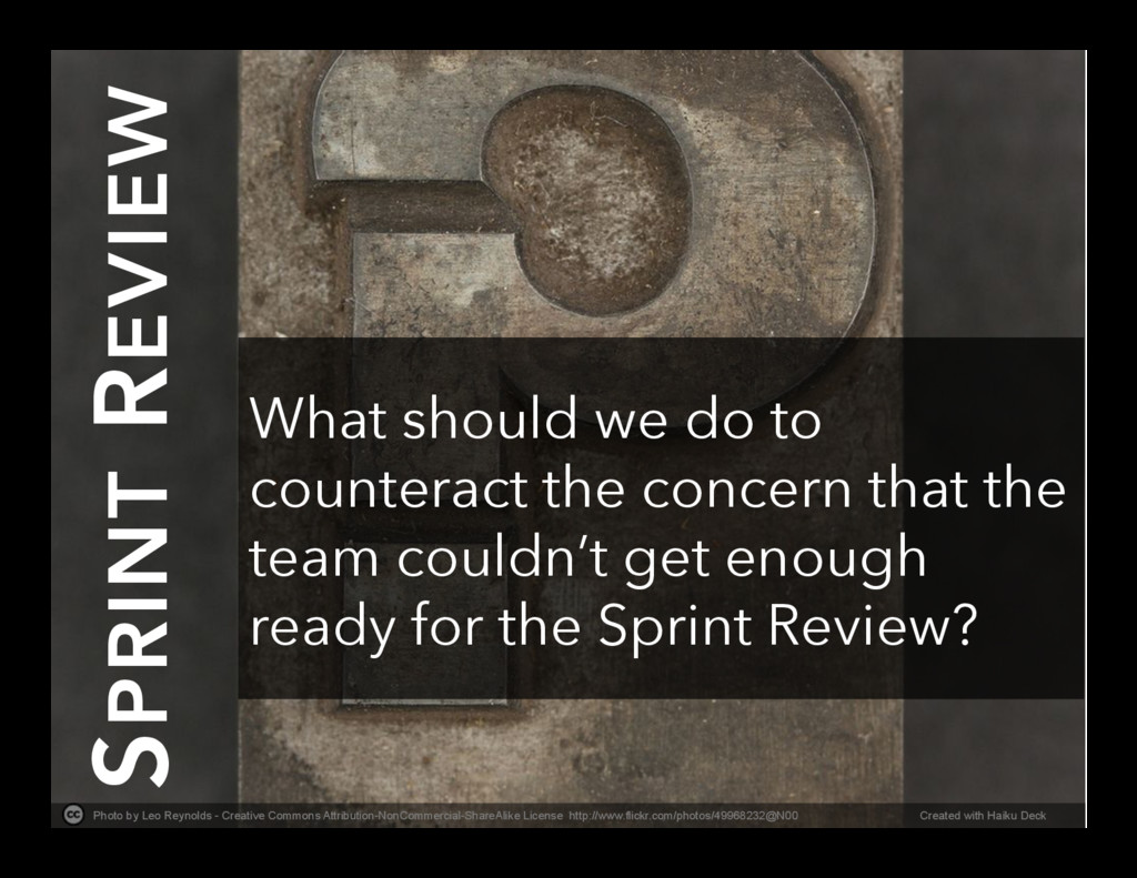 Creative Commons Attribution-NonCommercial-ShareAlike License http://www.flickr.com/photos/49968232@N00 Created with Haiku Deck SPRINT REVIEW What should we do to counteract the concern that the team couldn’t get enough ready for the Sprint Review?