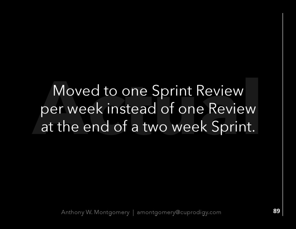Commons Attribution-ShareAlike License https://www.flickr.com/photos/52170719@N08 Created with Haiku Deck Actual 33 Started with an all-staff Retrospective on Day 3.
