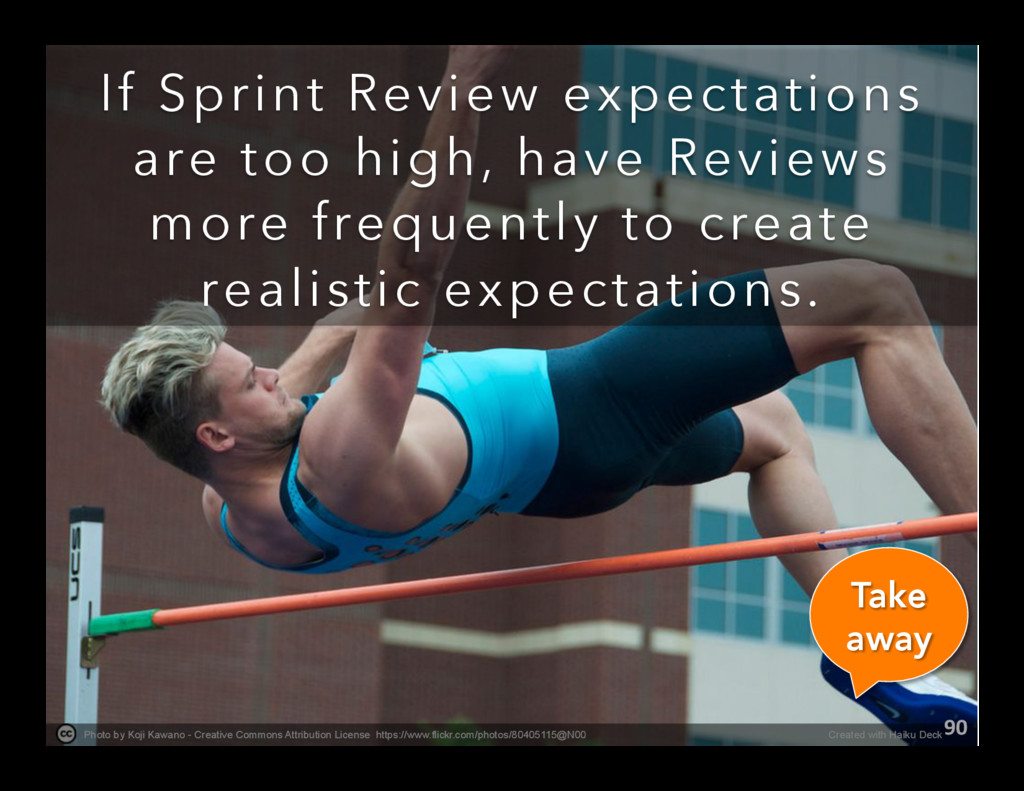 Kawano - Creative Commons Attribution License https://www.flickr.com/photos/80405115@N00 Created with Haiku Deck 90 If Sprint Review expectations are too high, have Reviews more frequently to create realistic expectations. Take away